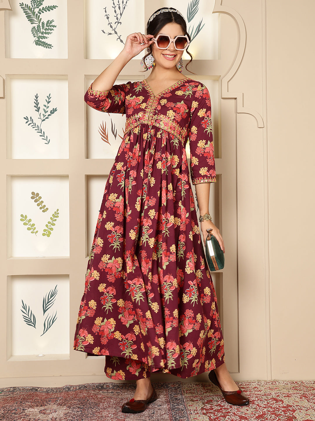Make a subtle yet stylish statement with Wine Rayon Calf Length Printed Flared 3/4 Sleeves...