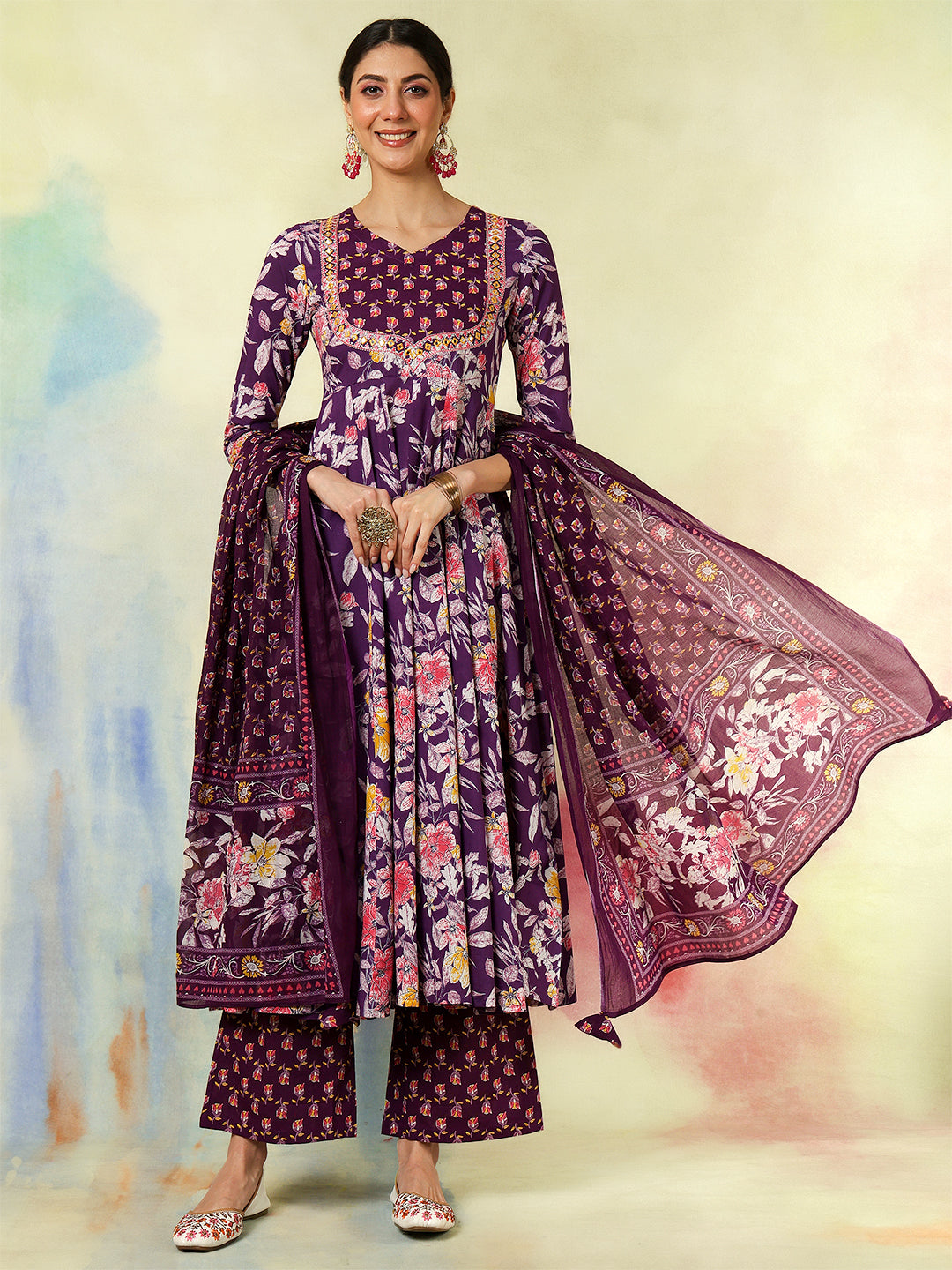 Purple Cotton Calf Length Printed & Embroidered Flared 3/4 Sleeves Sweet Heart Neck Kurta Suit Set