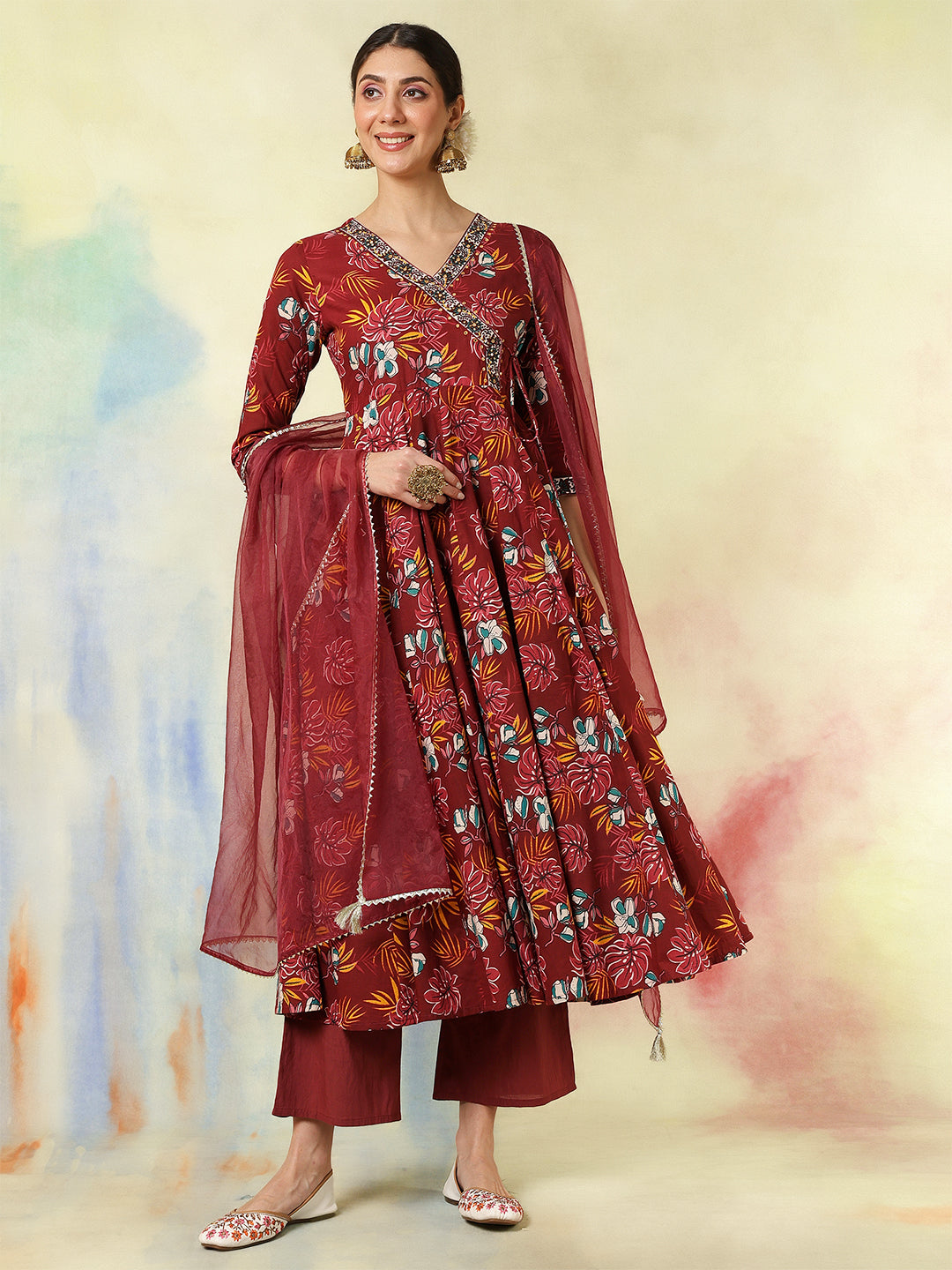 Maroon Cotton Calf Length Printed Flared 3/4 Sleeves V-Neck Kurta Suit Set