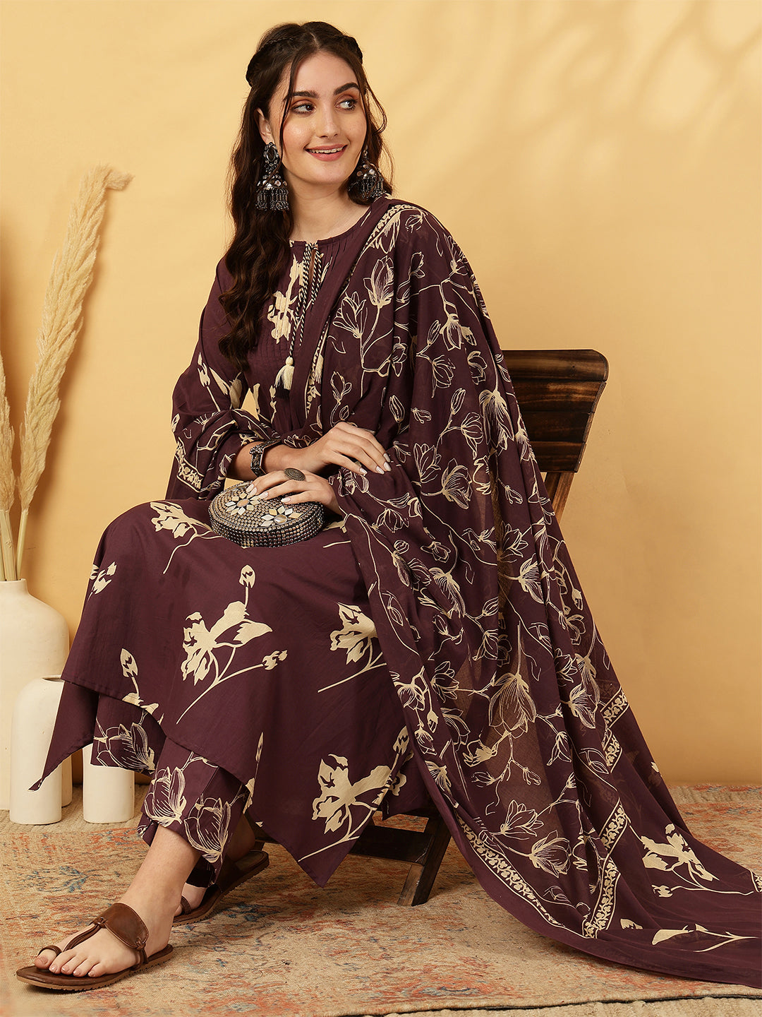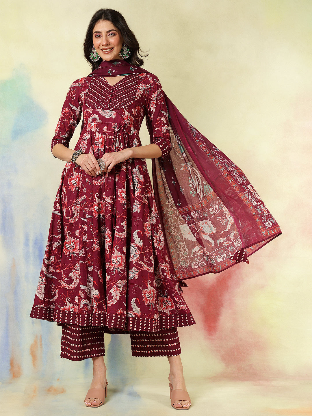 Maroon Cotton Calf Length Printed Flared 3/4 Sleeves V-Neck Kurta Suit Set is crafted for...