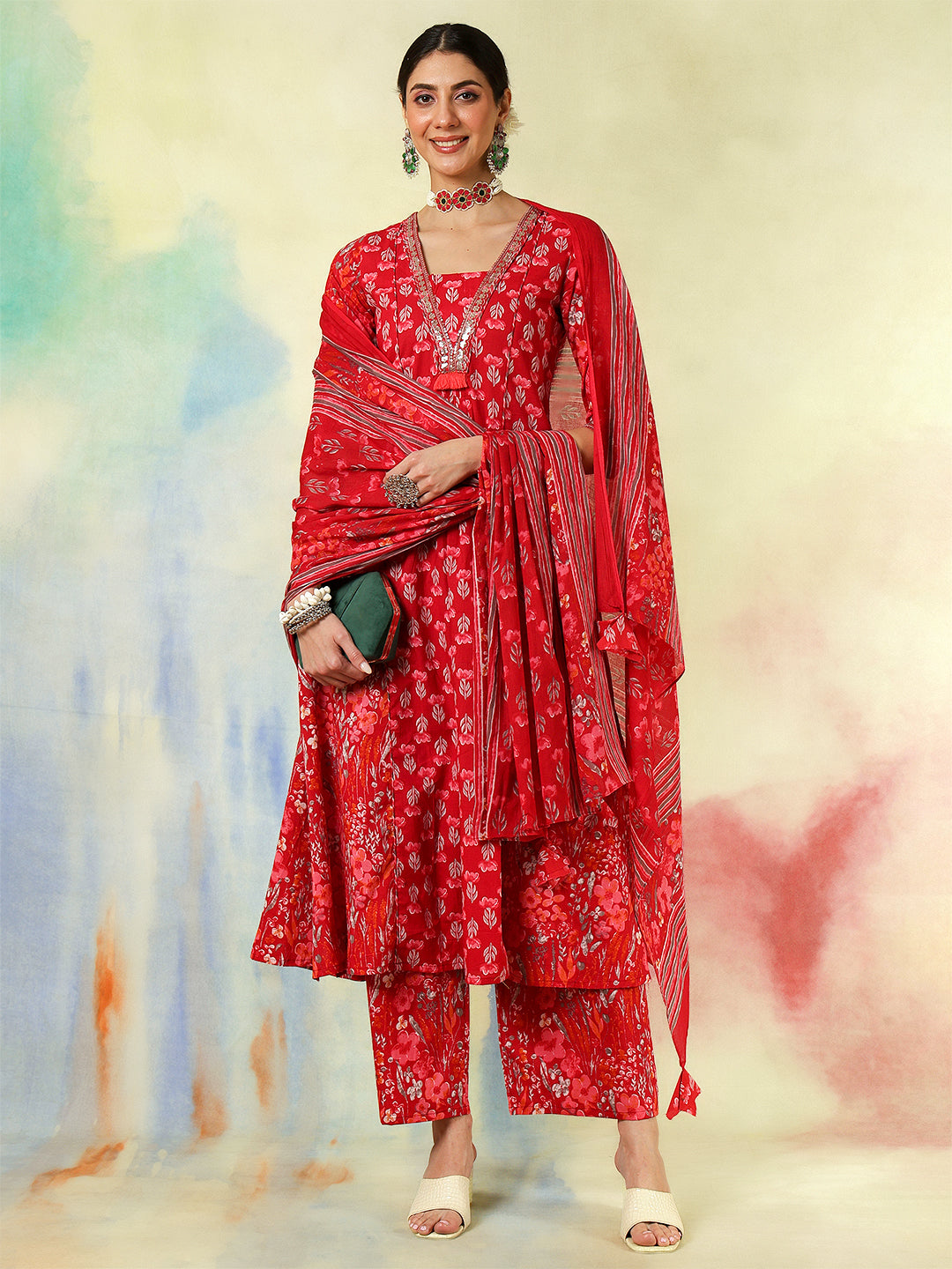 Red Cotton Calf Length Embroidered Printed A-Line 3/4 Sleeves V-Neck Kurta Suit Set