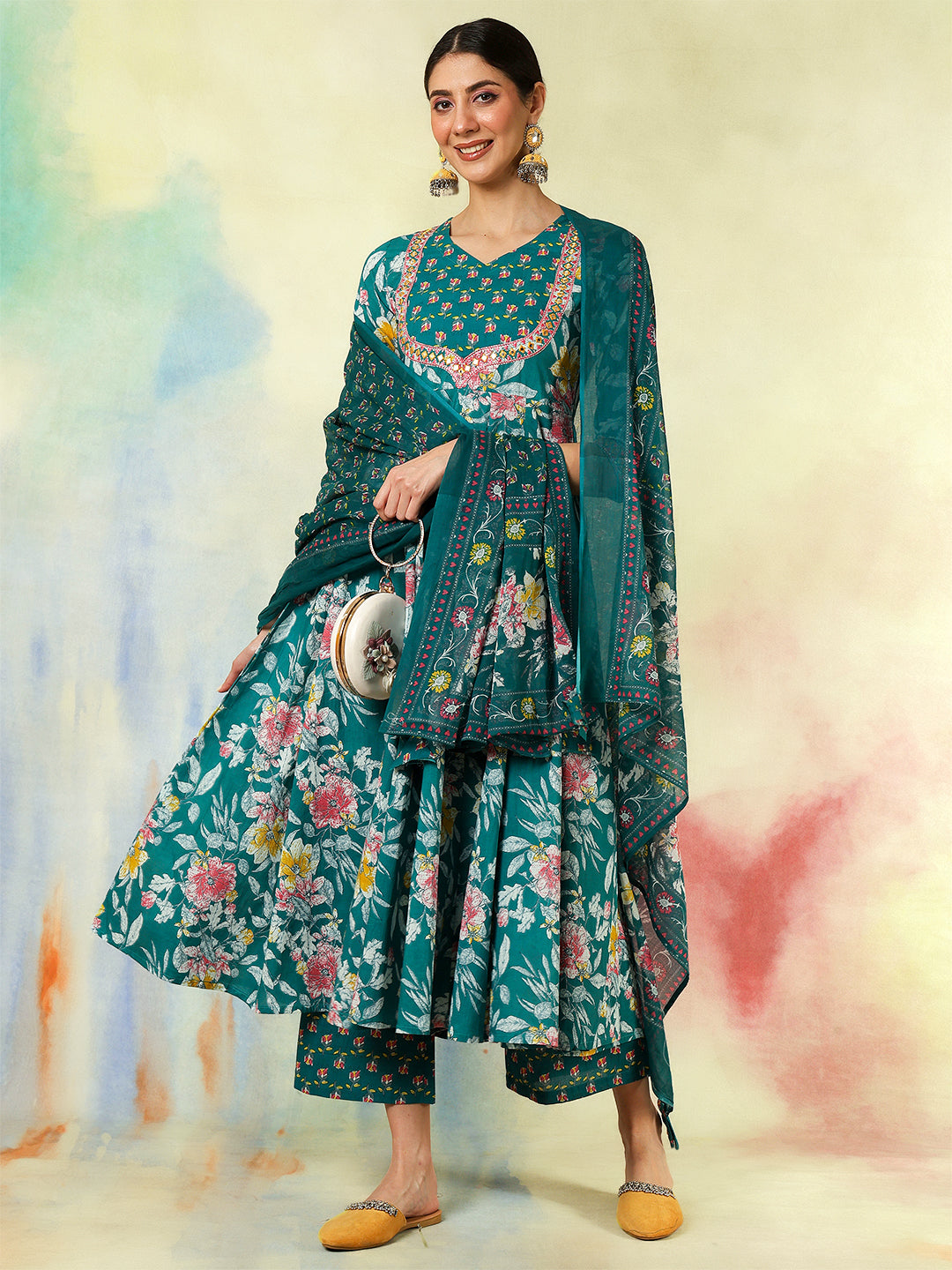 Teal Cotton Calf Length Printed & Embroidered Flared 3/4 Sleeves Sweet Heart Neck Kurta Suit Set