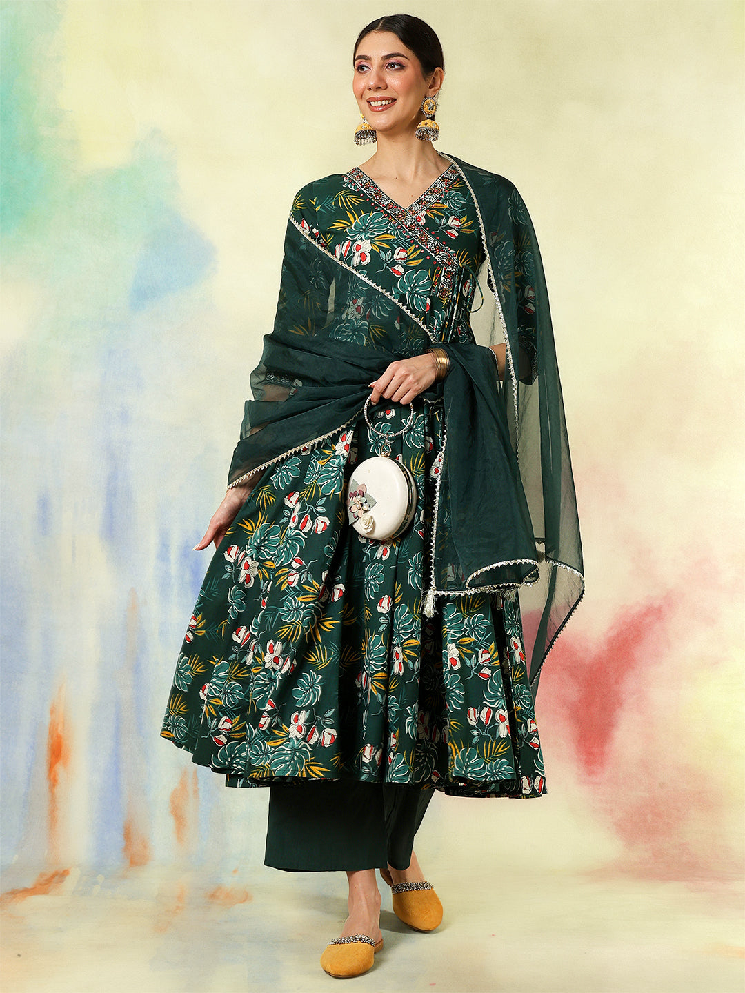 Green Cotton Calf Length Printed 3/4 Sleeves V-Neck Anarkali Kurta Suit Set