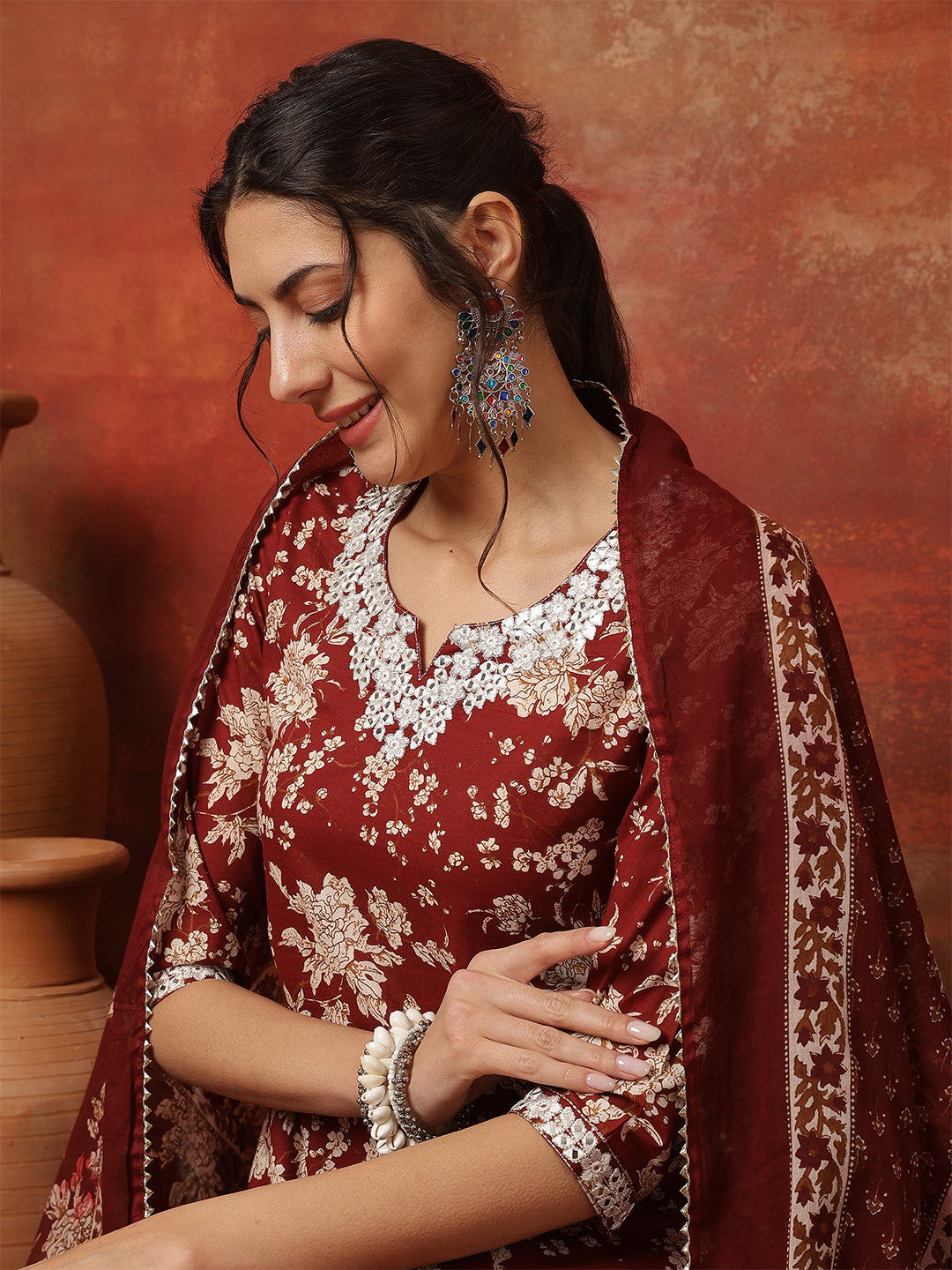 Maroon Cotton Calf Length Printed 3/4 Sleeves Round Neck Straight Kurta Suit Set