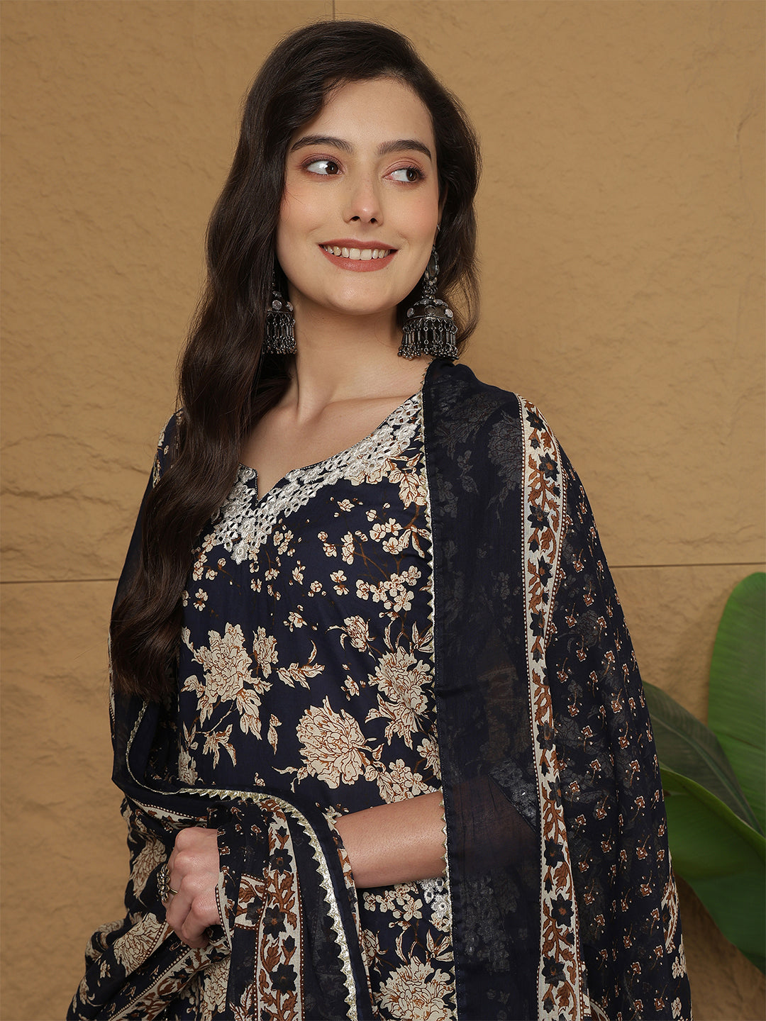 Navy Cotton Calf Length Printed 3/4 Sleeves Round Neck Straight Kurta Suit Set brings a...
