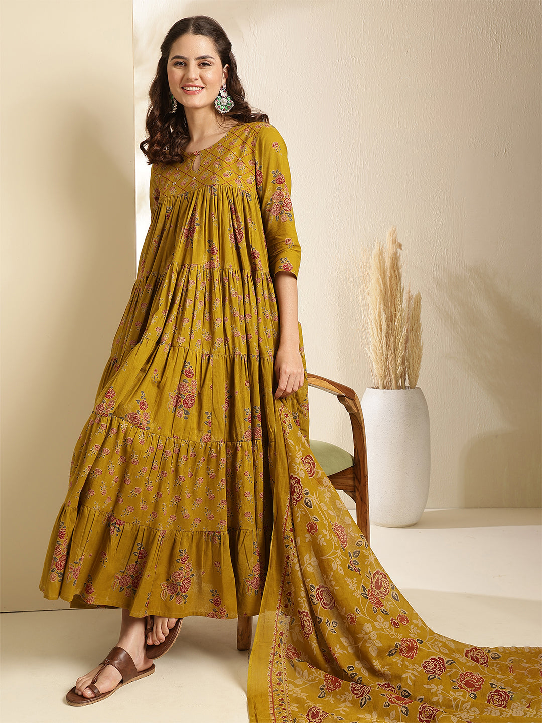 Mustard Cotton Calf Length Printed 3/4 Sleeve Key Hole Neck Tired Kurta Suit Set