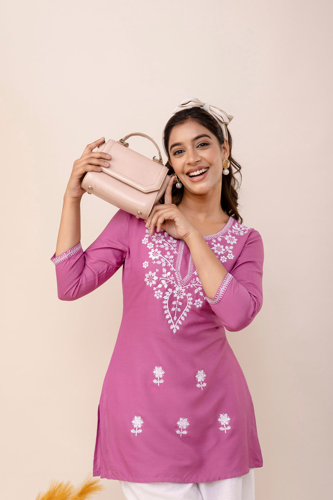 Pink Rayon Hip Length Round Neck A-Line Top is crafted for those who love timeless...