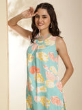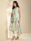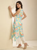 Aqua Rayon Calf Length Printed Sleeveless Round Neck Asymmetrical Kurta