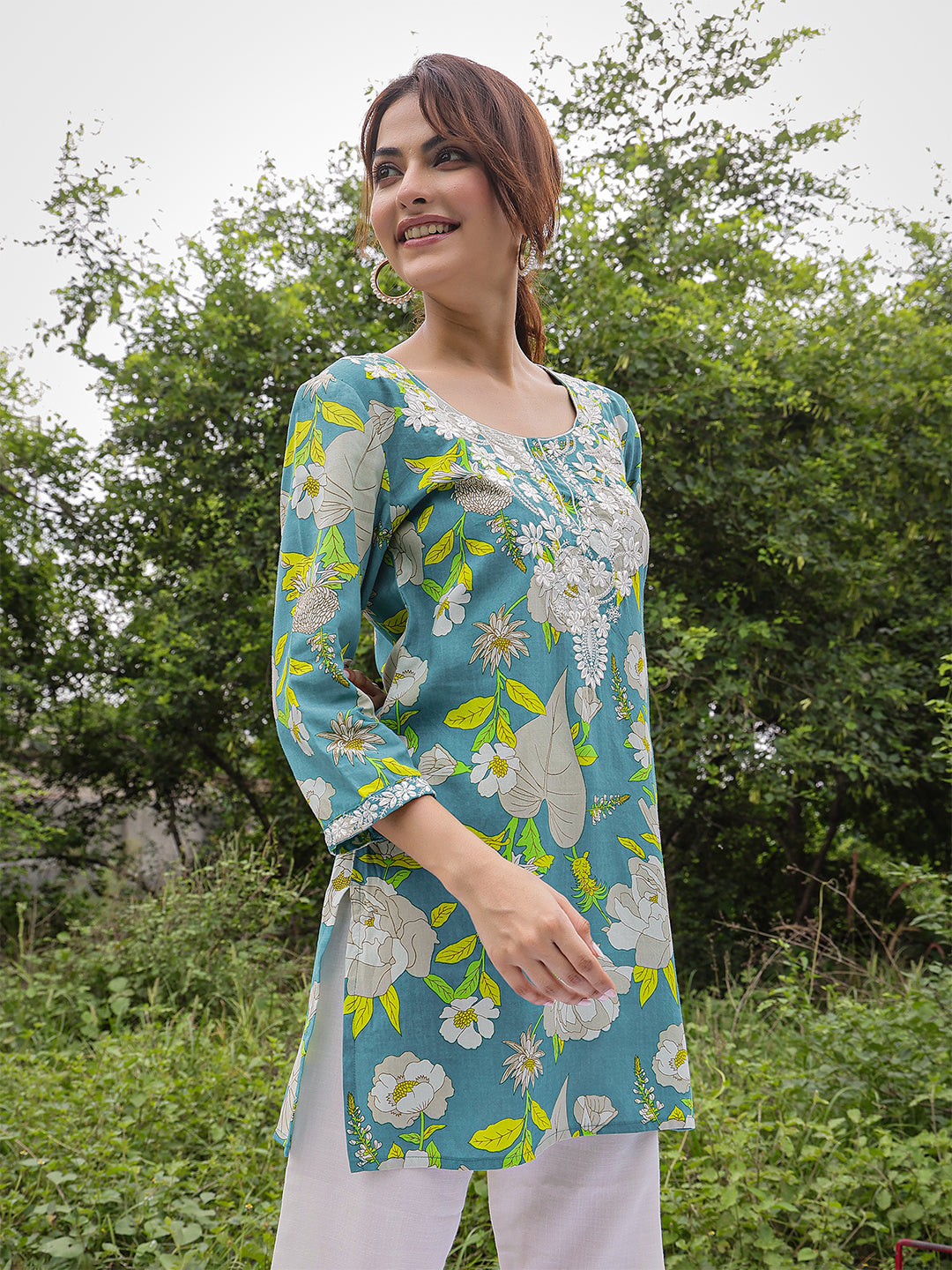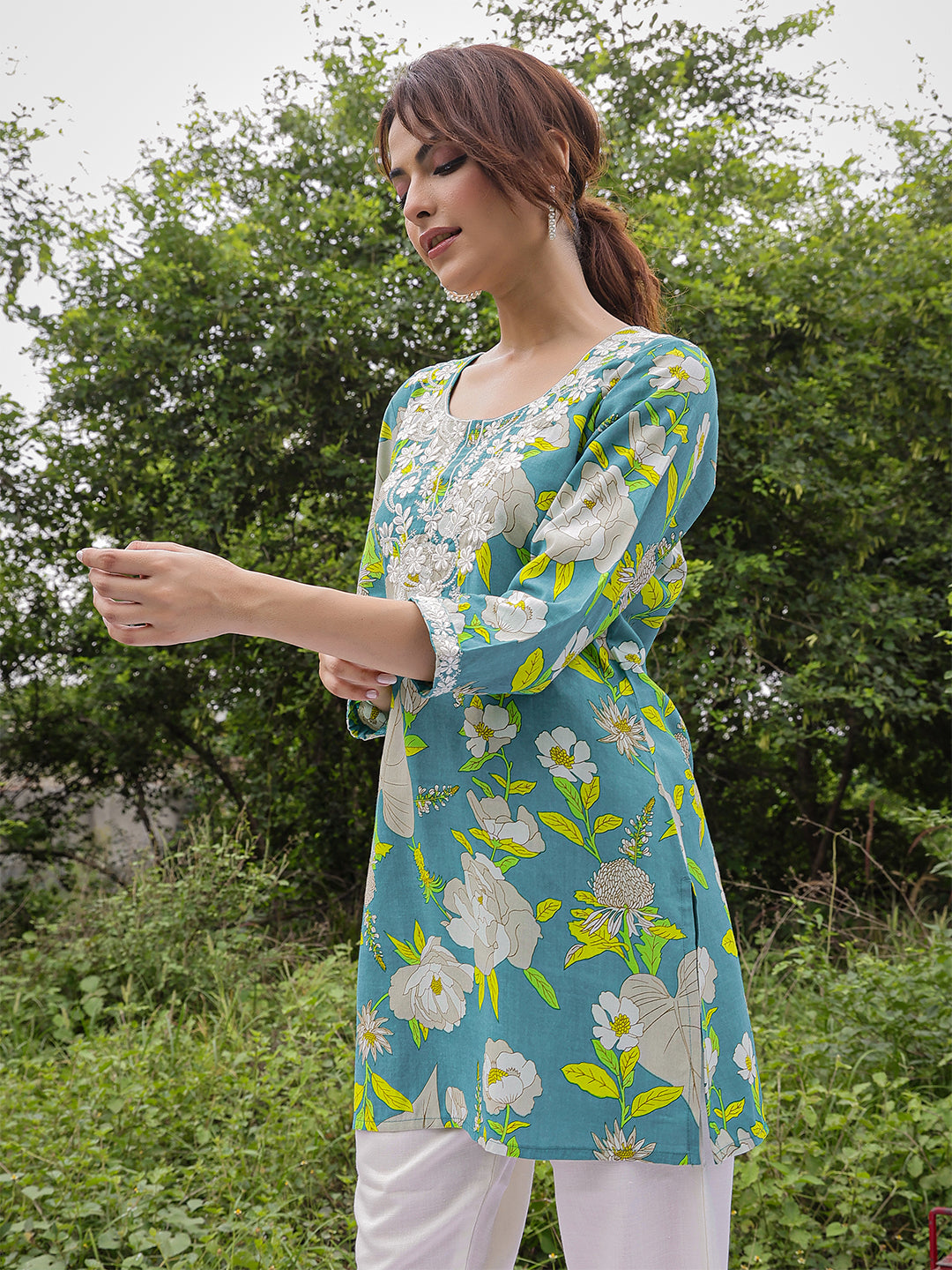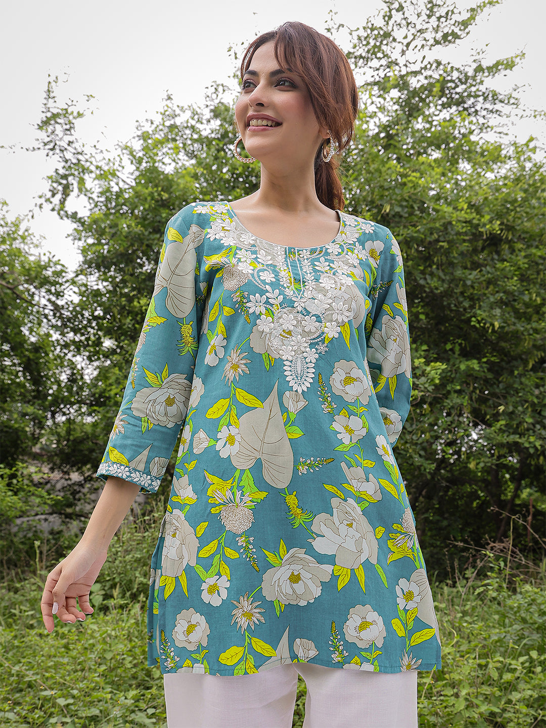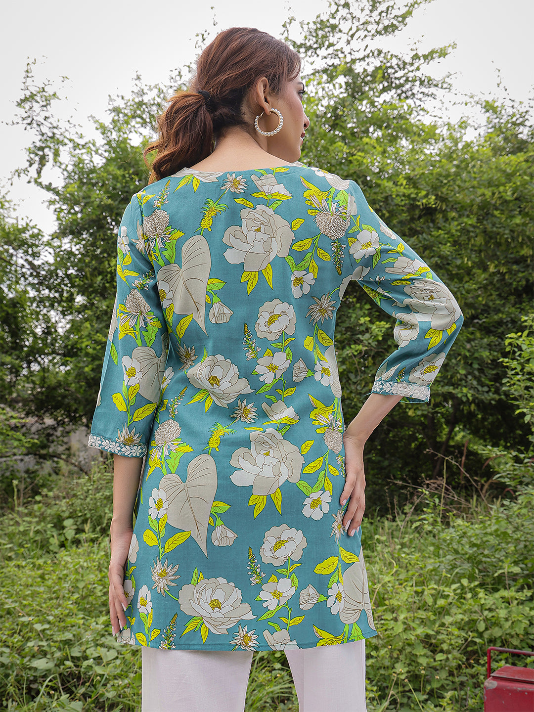Aqua Rayon Hip Length Printed 3/4 Sleeve Round Neck Straight Top adds a refined charm to your wardrobe with its thoughtfully crafted silhouette. Light, comfortable and stylish, it works well for daily use, informal meet-ups or relaxed occasions, keeping you effortlessly fashionable.