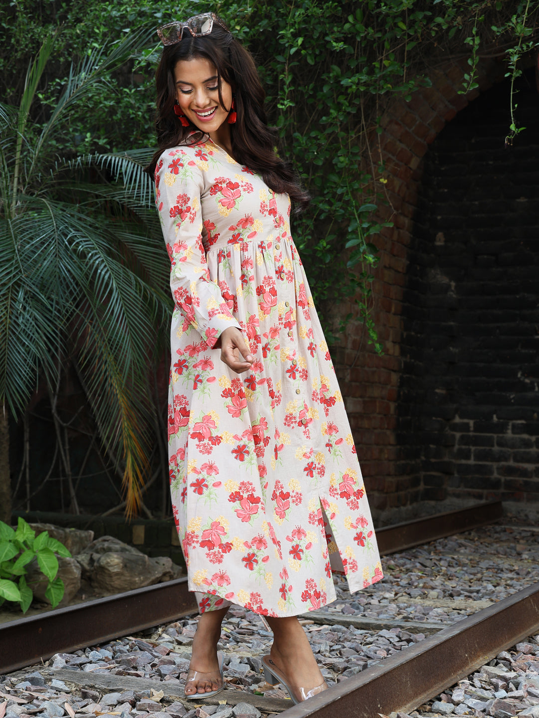 Beige Cotton Calf Length Printed A-Line Full Sleeves Coller Kurta is crafted for those who love timeless fashion with everyday ease. The outfit drapes naturally, offering both movement and style. Suitable for work hours or simple day outings, it promises a refreshing and sophisticated touch.