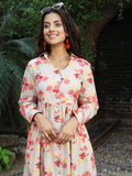 Beige Cotton Calf Length Printed A-Line Full Sleeves Coller Kurta