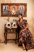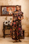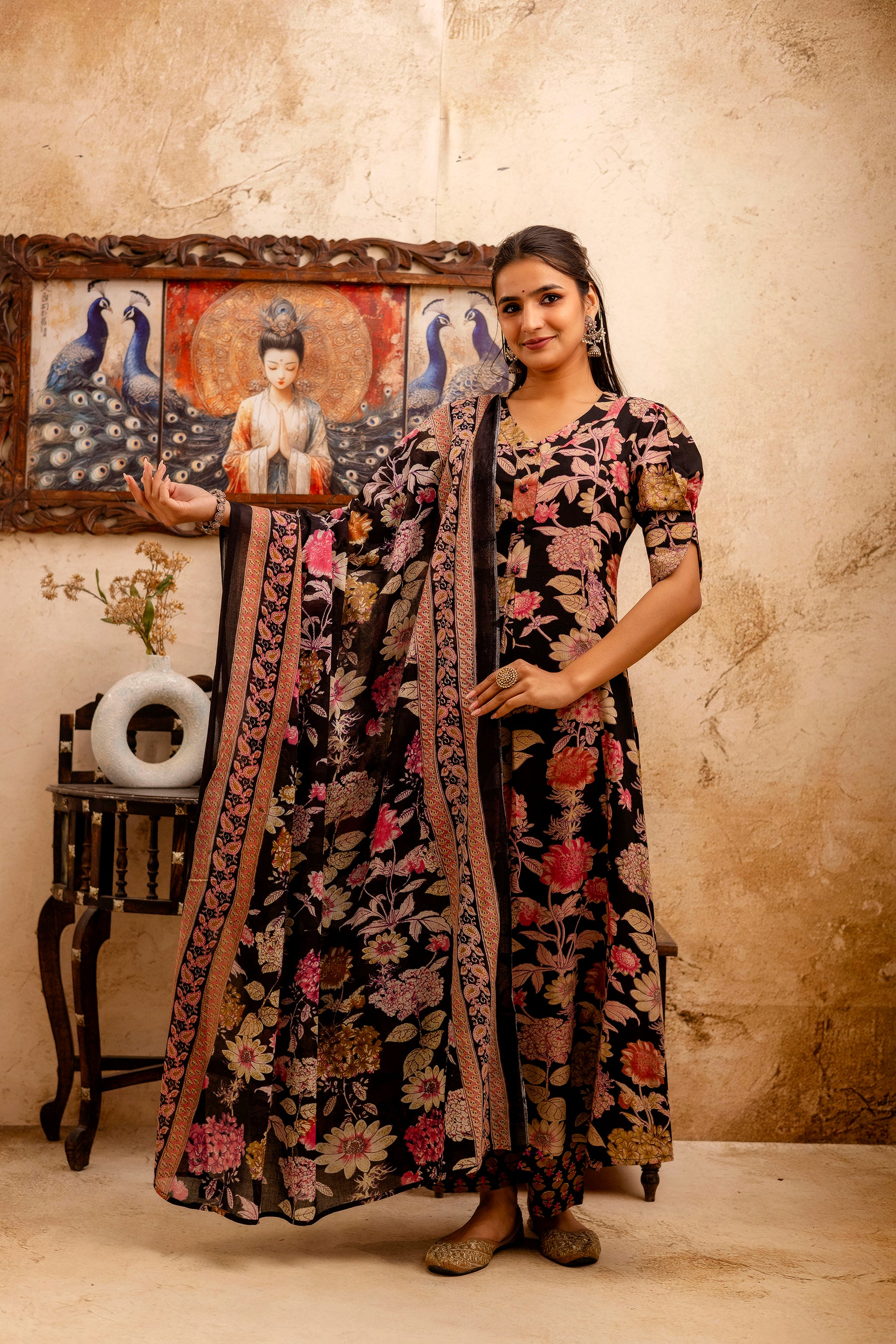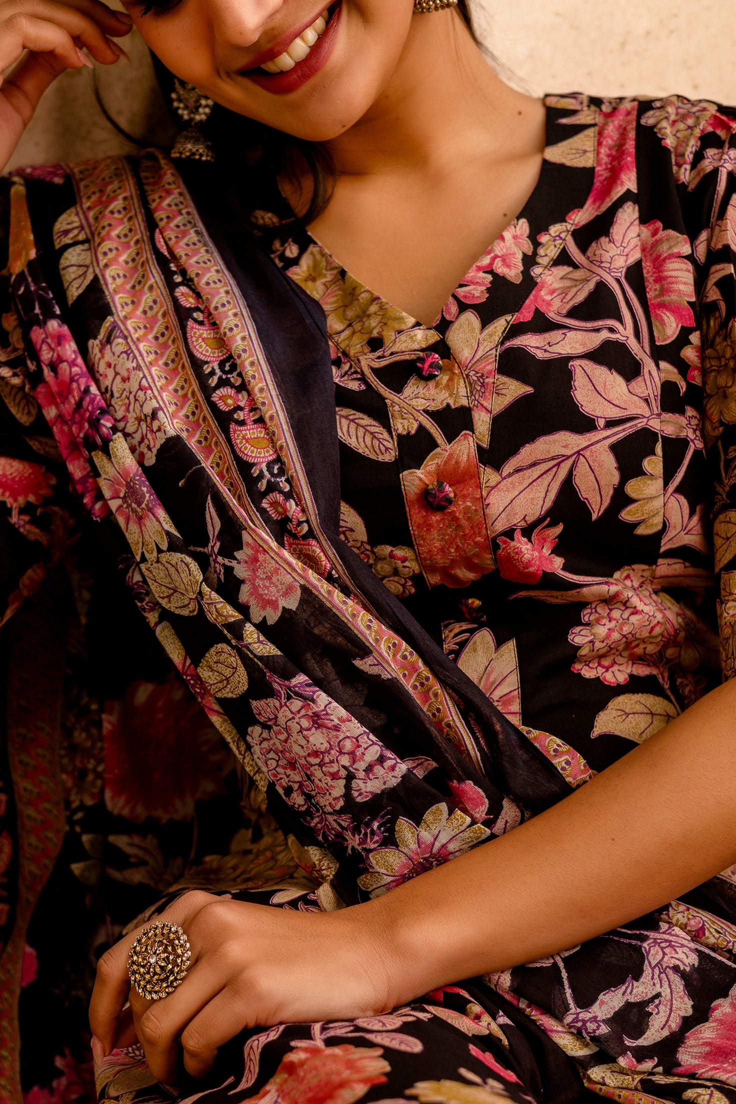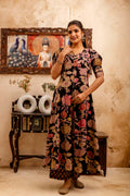 Upgrade your wardrobe with Black Cotton Calf Length Printed Flared 3/4 Sleeves V-Neck Kurta Suit Set, designed for a chic and versatile appeal. The silhouette falls beautifully, giving a flattering shape while keeping the outfit breathable. A perfect pick for casual gatherings, office wear and everyday elegance.