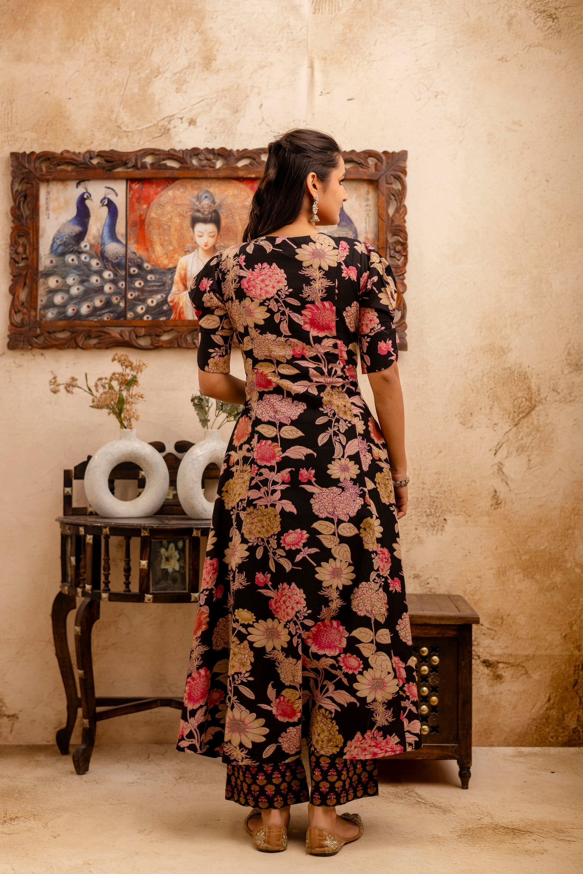 Black Cotton Calf Length Printed Flared 3/4 Sleeves V-Neck Kurta Suit Set