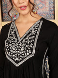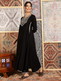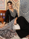 Black Rayon Calf Length Solid Flared 3/4 Sleeves V-Neck Kurta Bottom Dupatta Set