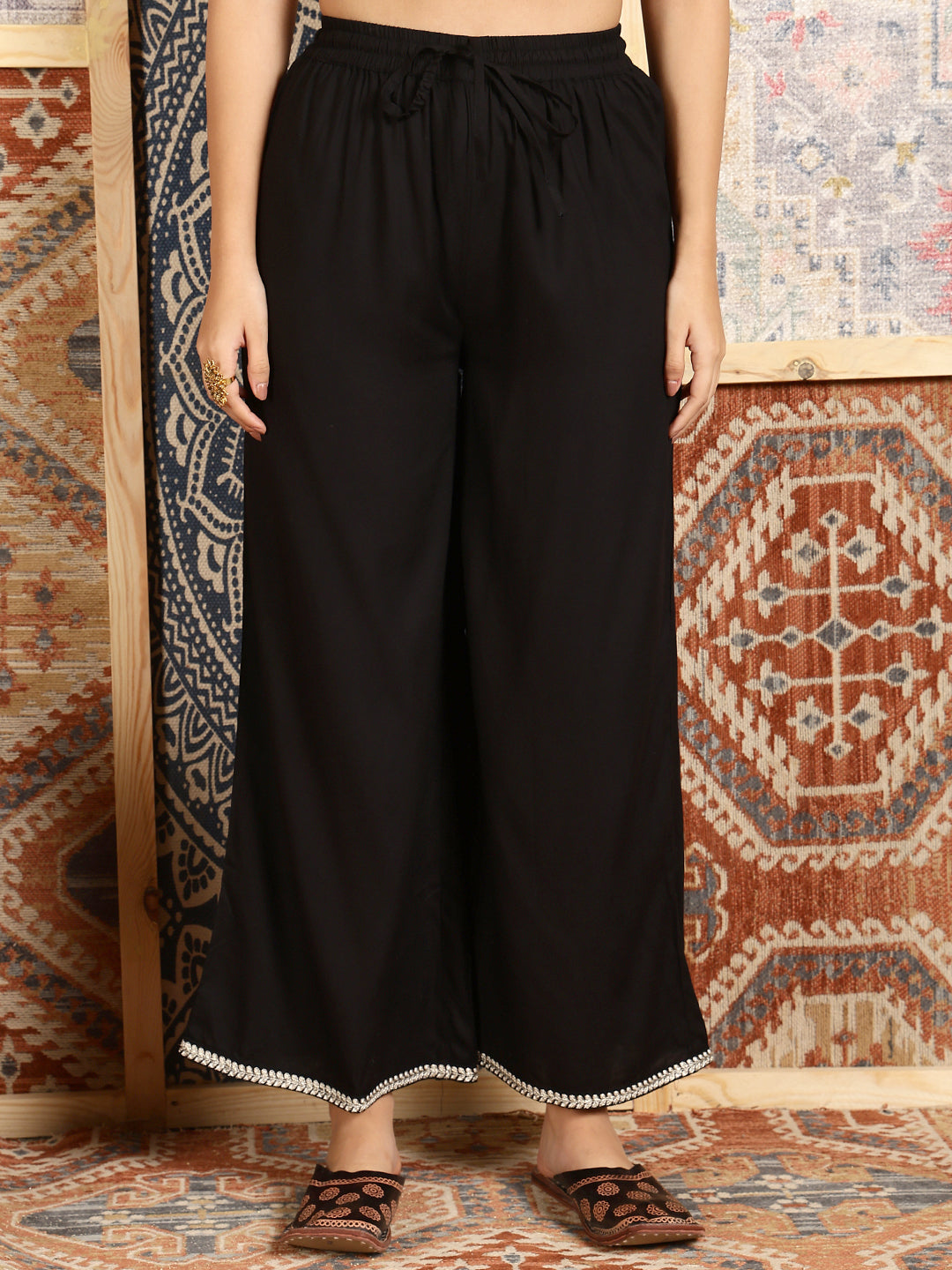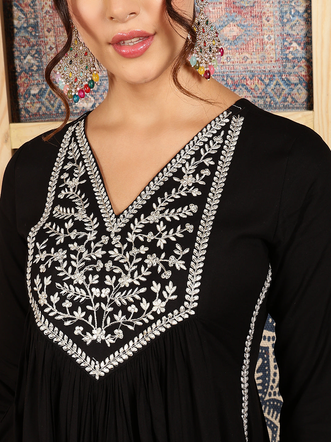Black Rayon Calf Length Solid Flared 3/4 Sleeves V-Neck Kurta Bottom Dupatta Set is crafted for those who love timeless fashion with everyday ease. The outfit drapes naturally, offering both movement and style. Suitable for work hours or simple day outings, it promises a refreshing and sophisticated touch.