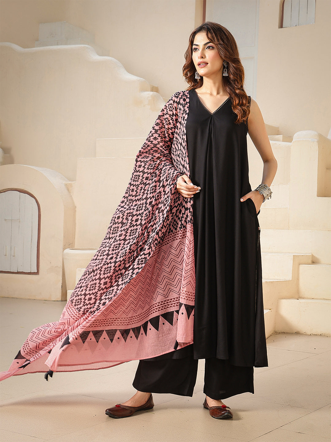 Black Rayon Calf Length Solid Sleeveless V-Neck A-Line Kurta Suit Set brings a fresh blend of comfort and elegance, crafted with attention to detail. Its design makes it perfect for daily wear as well as casual outings, offering effortless style. Soft fabric ensures comfort through the day, keeping the look refined and graceful.