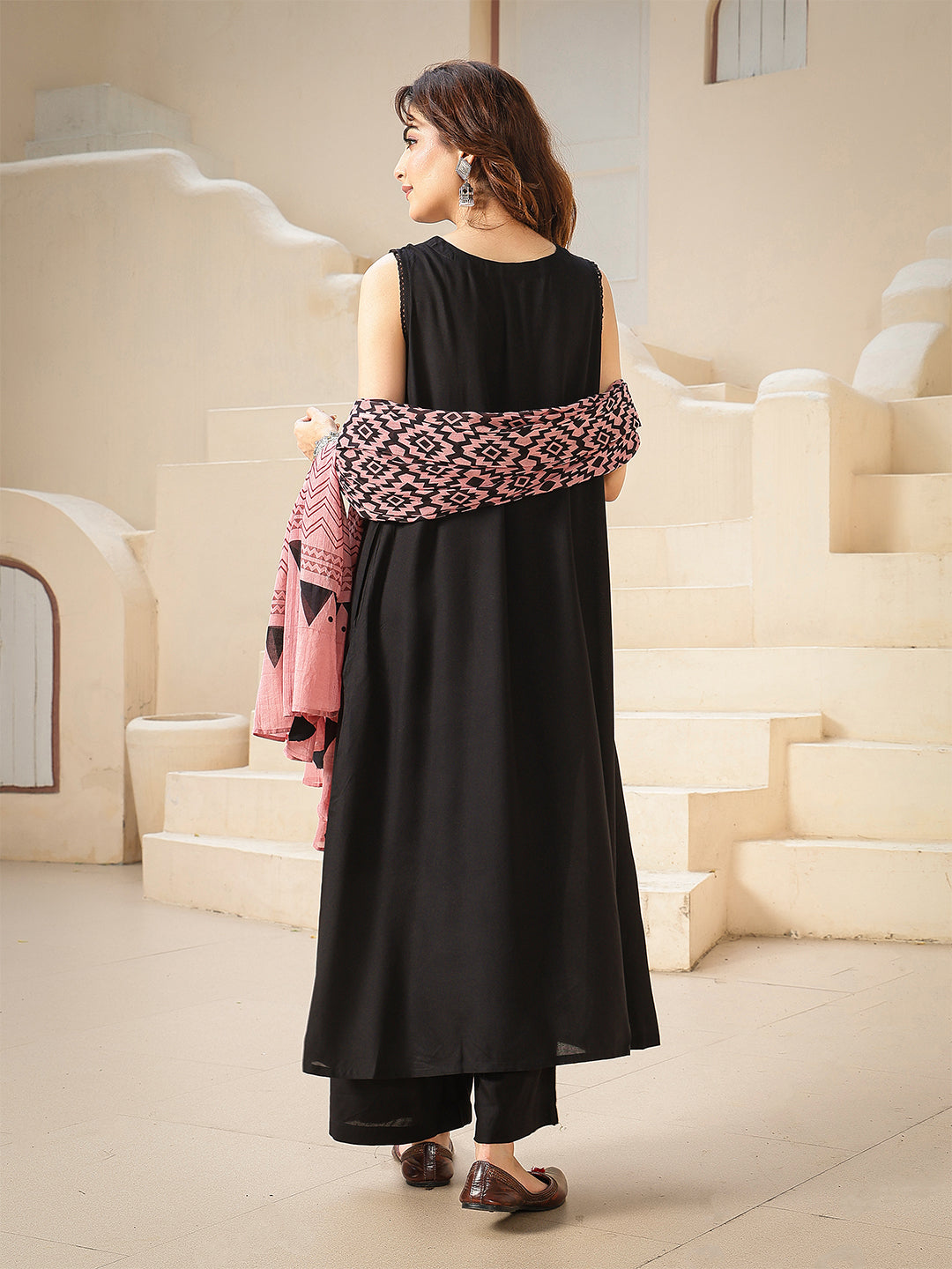 Black Rayon Calf Length Solid Sleeveless V-Neck A-Line Kurta Suit Set