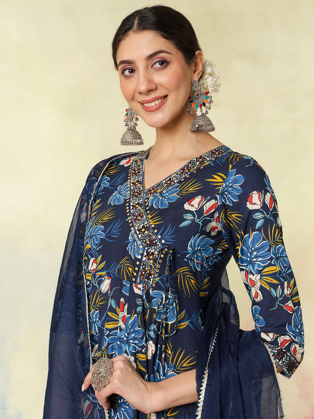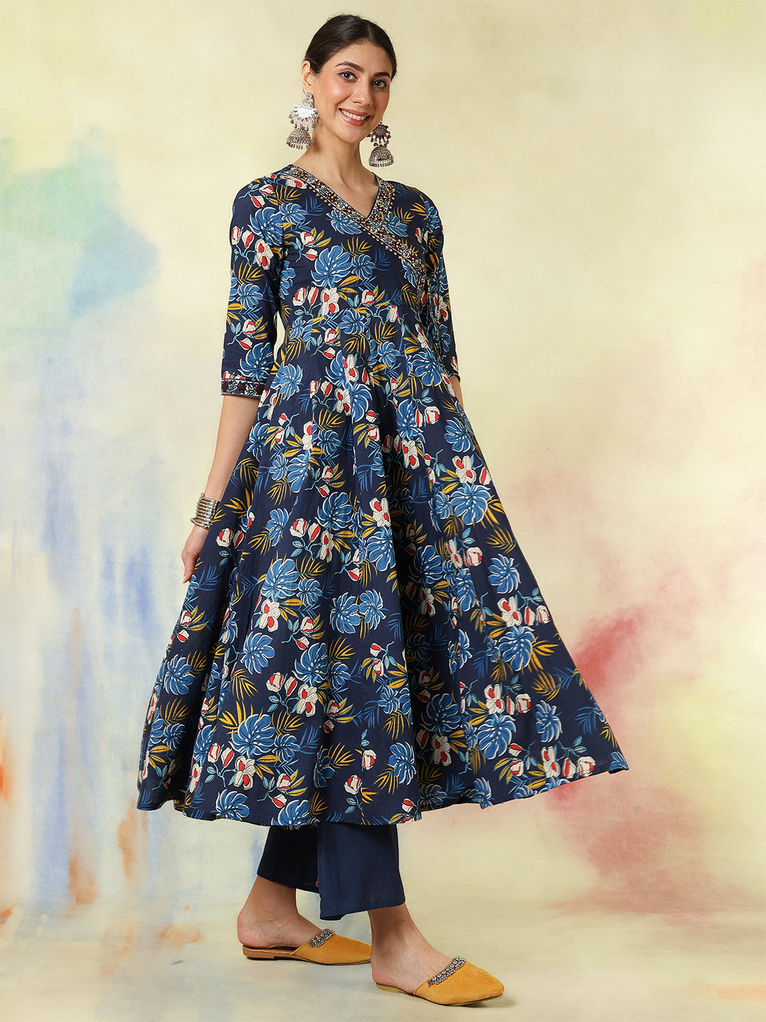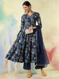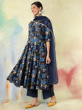 Upgrade your wardrobe with Blue Cotton Calf Length Printed Embroidered 3/4 Sleeves V-Neck Kurta Suit Set, designed for a chic and versatile appeal. The silhouette falls beautifully, giving a flattering shape while keeping the outfit breathable. A perfect pick for casual gatherings, office wear and everyday elegance.