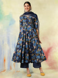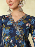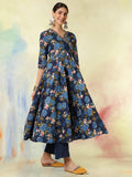 Blue Cotton Calf Length Printed Embroidered 3/4 Sleeves V-Neck Kurta Suit Set