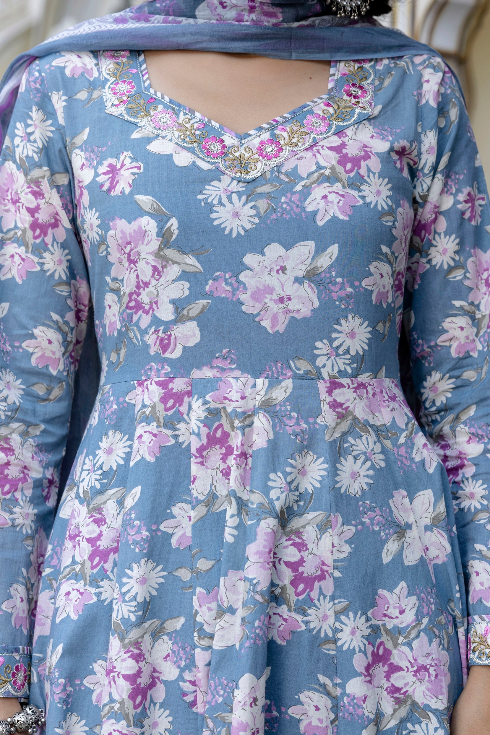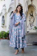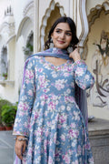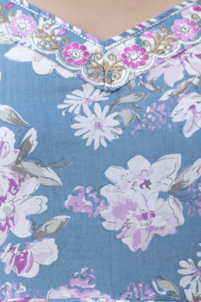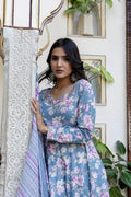 Upgrade your wardrobe with Blue Cotton Calf Length Printed Flared 3/4 Sleeves Sweetheart Neck Kurta Suit Set, designed for a chic and versatile appeal. The silhouette falls beautifully, giving a flattering shape while keeping the outfit breathable. A perfect pick for casual gatherings, office wear and everyday elegance.