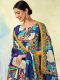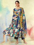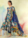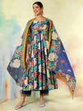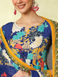 Blue Cotton Flared Printed A-Line 3/4 Sleeves Round Neck Kurta Suit Set