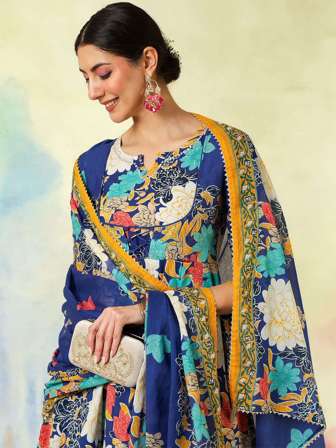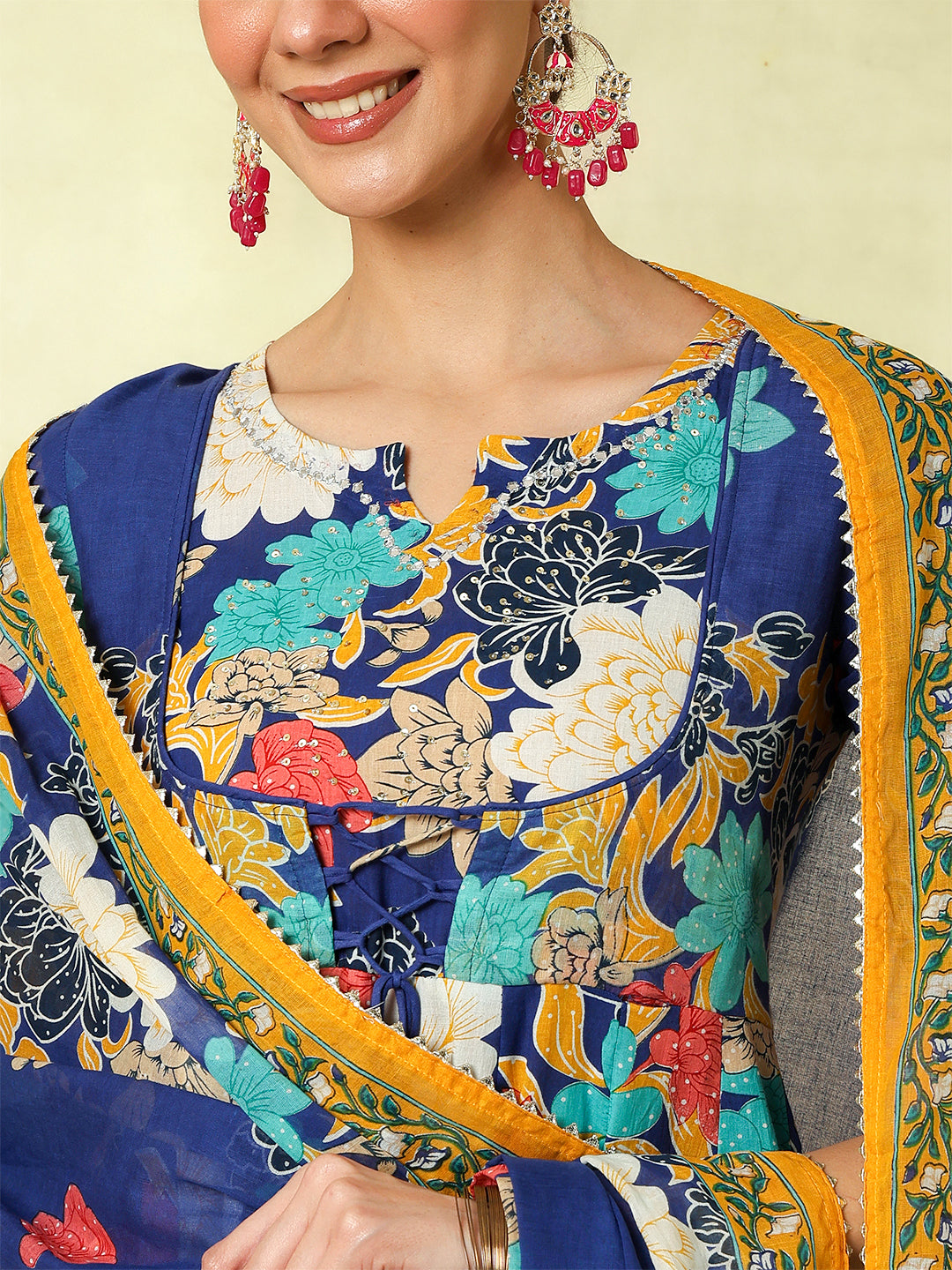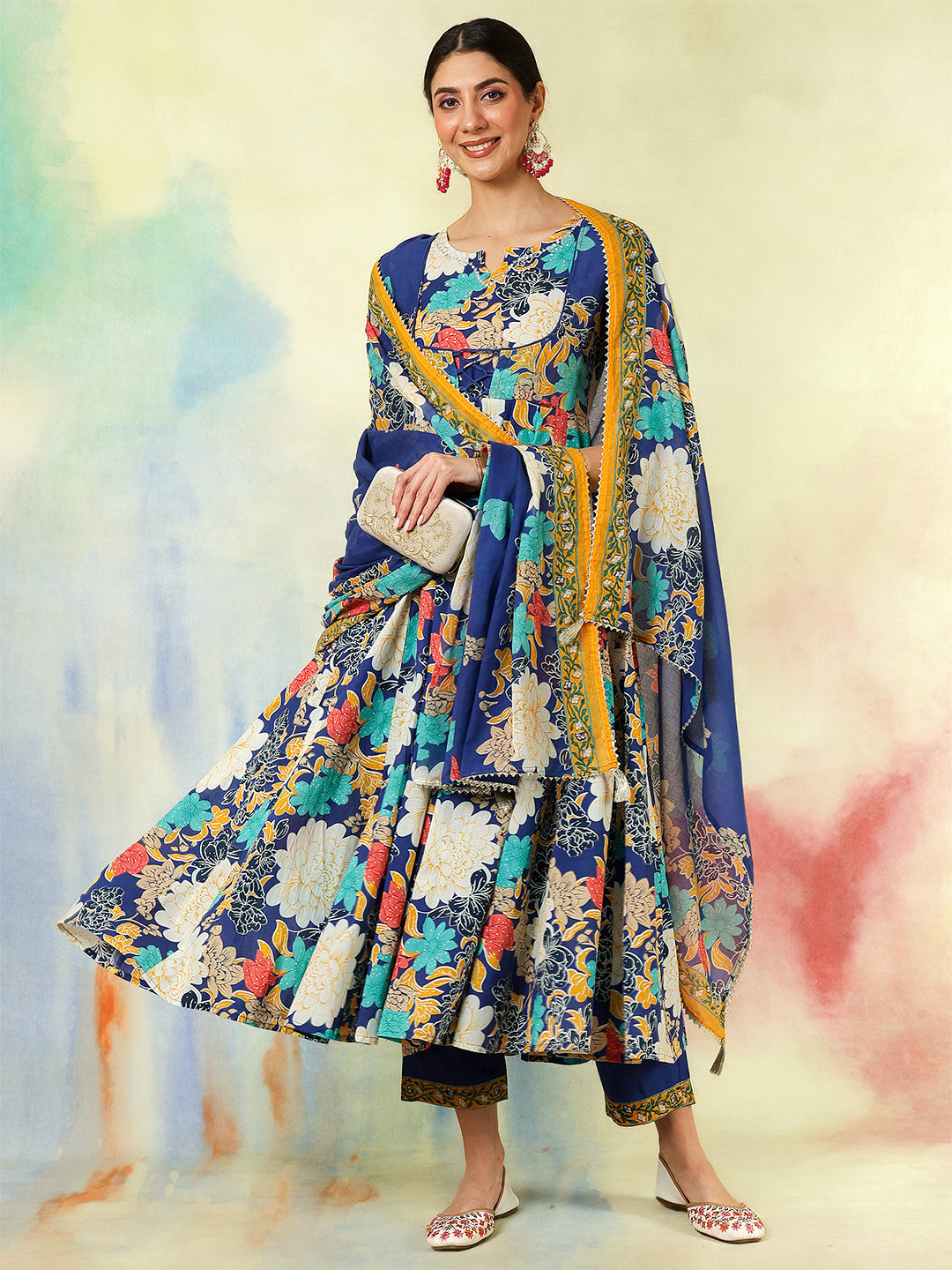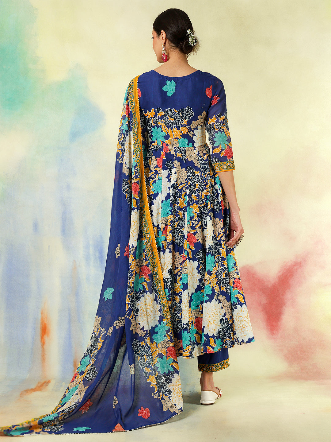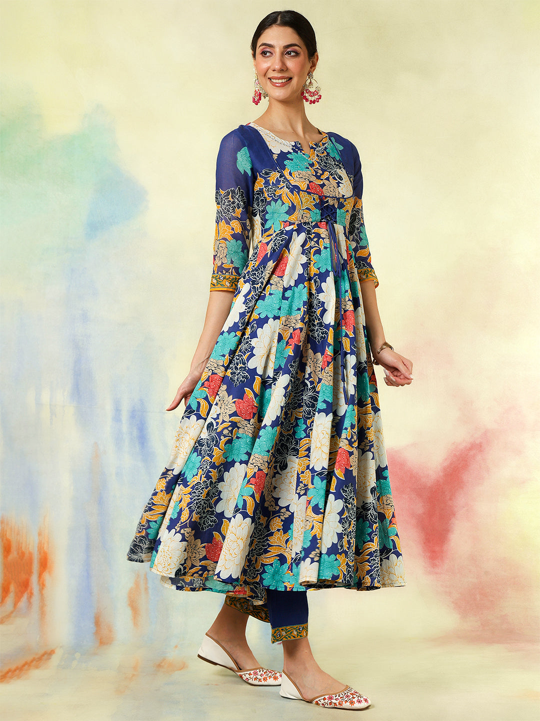 Blue Cotton Flared Printed A-Line 3/4 Sleeves Round Neck Kurta Suit Set brings a fresh blend of comfort and elegance, crafted with attention to detail. Its design makes it perfect for daily wear as well as casual outings, offering effortless style. Soft fabric ensures comfort through the day, keeping the look refined and graceful.