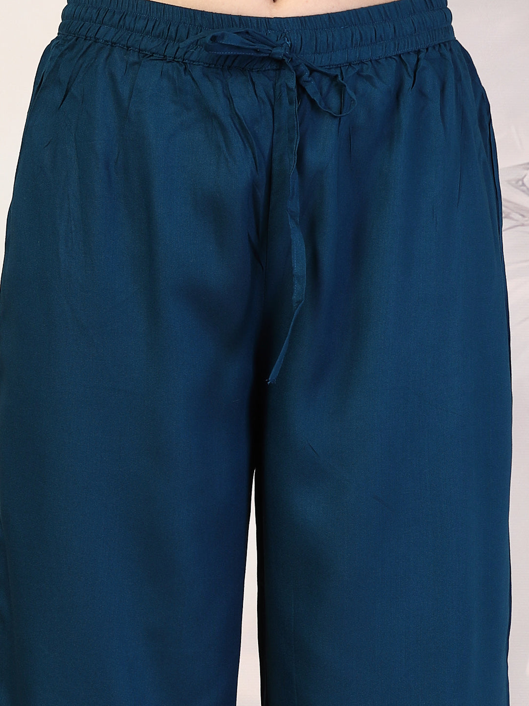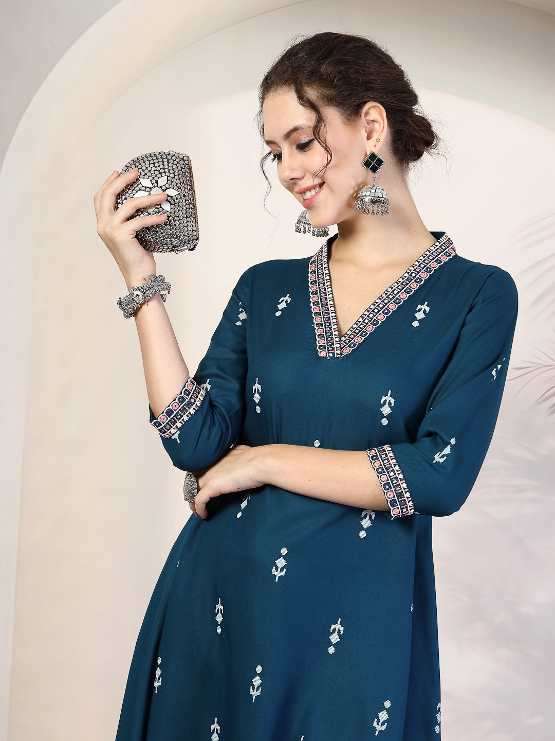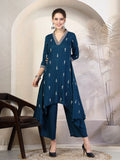 Make a subtle yet stylish statement with Blue Rayon Calf Length Printed Asymmetric 3/4 Sleeves V Neck Kurta Suit Set. The design offers a balanced mix of modern charm and traditional comfort. Its easy-fit structure makes it ideal for long hours, while the overall look stays effortlessly polished.