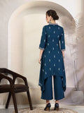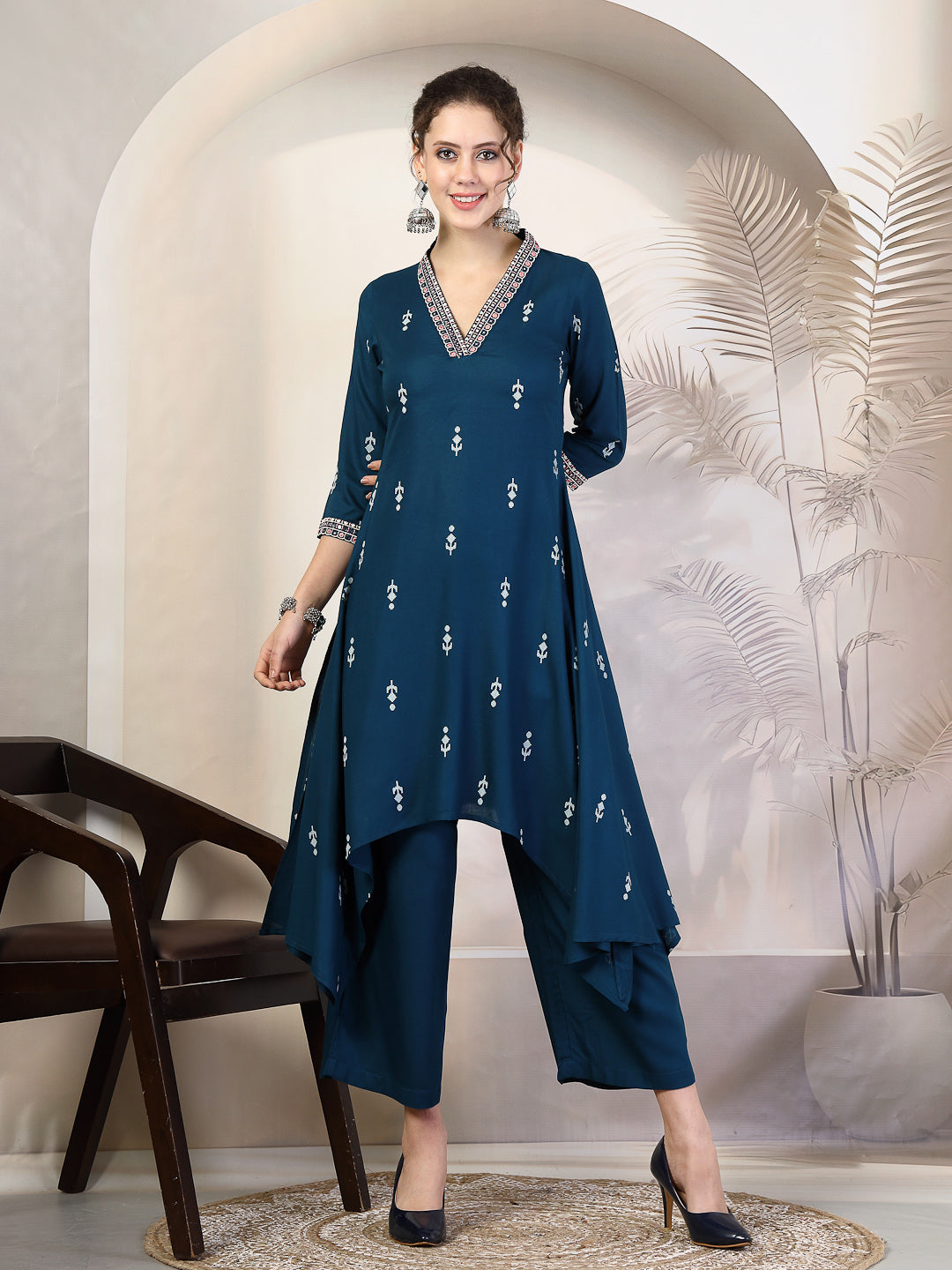 Blue Rayon Calf Length Printed Asymmetric 3/4 Sleeves V Neck Kurta Suit Set
