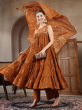 Brown Cotton Calf Length Printed Sleeveless Round Neck Flared Kurta Suit Set