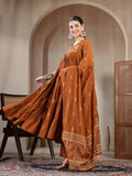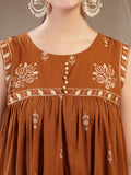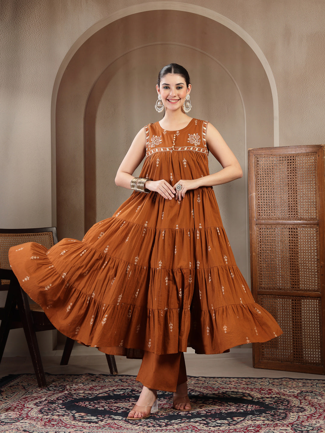 Brown Cotton Calf Length Printed Sleeveless Round Neck Flared Kurta Suit Set adds a refined charm to your wardrobe with its thoughtfully crafted silhouette. Light, comfortable and stylish, it works well for daily use, informal meet-ups or relaxed occasions, keeping you effortlessly fashionable.