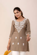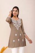 Brown Rayon Hip Length Round Neck A-Line Top