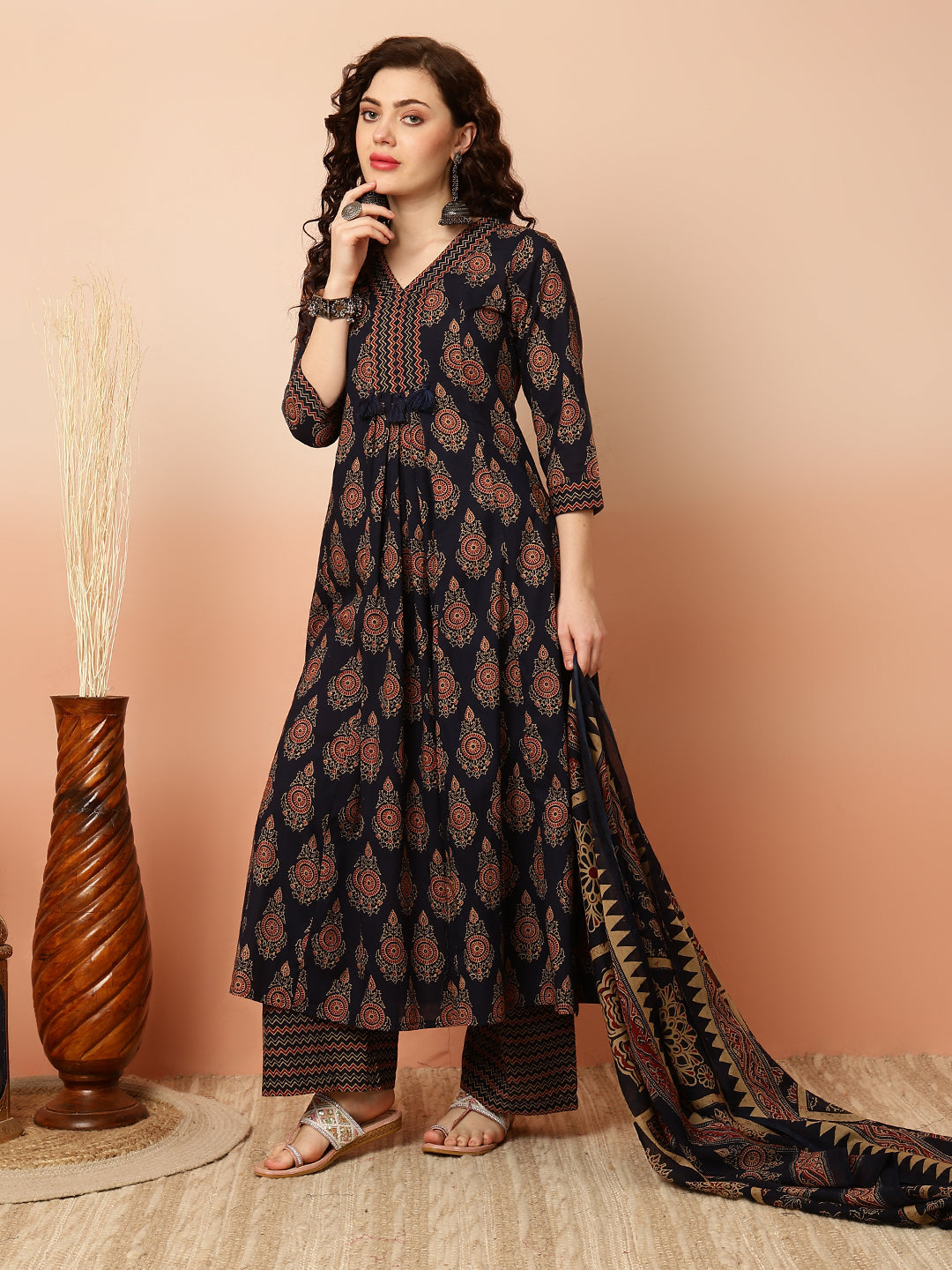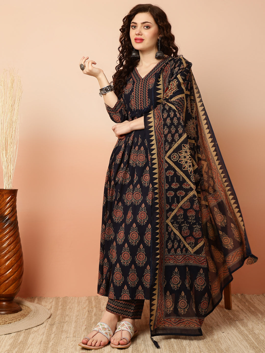 Calf Length Semi-Flared 3/4 Sleeves V Kurta Bottom Dupatta Set