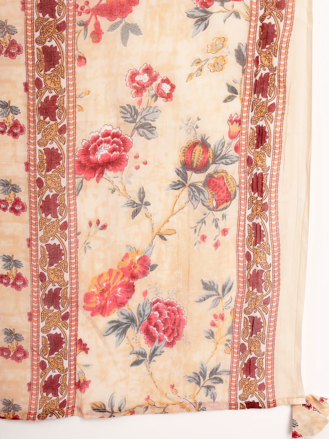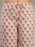 Cream Cotton Calf Length Printed 3/4 Sleeve Key Hole Neck Flared Kurta Suit Set