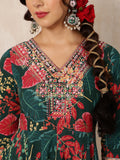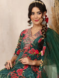 Green Cotton Calf Length Printed Flared 3/4 Sleeves V-Neck Kurta Bottom Dupatta Set