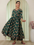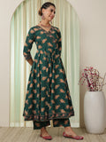 Green Cotton Calf Length Printed Flared 3/4 Sleeves V-Neck Kurta Suit Set