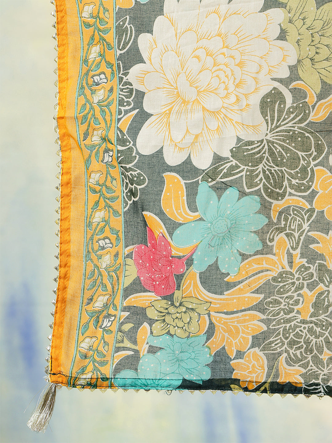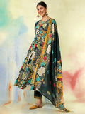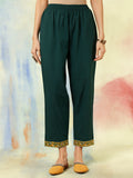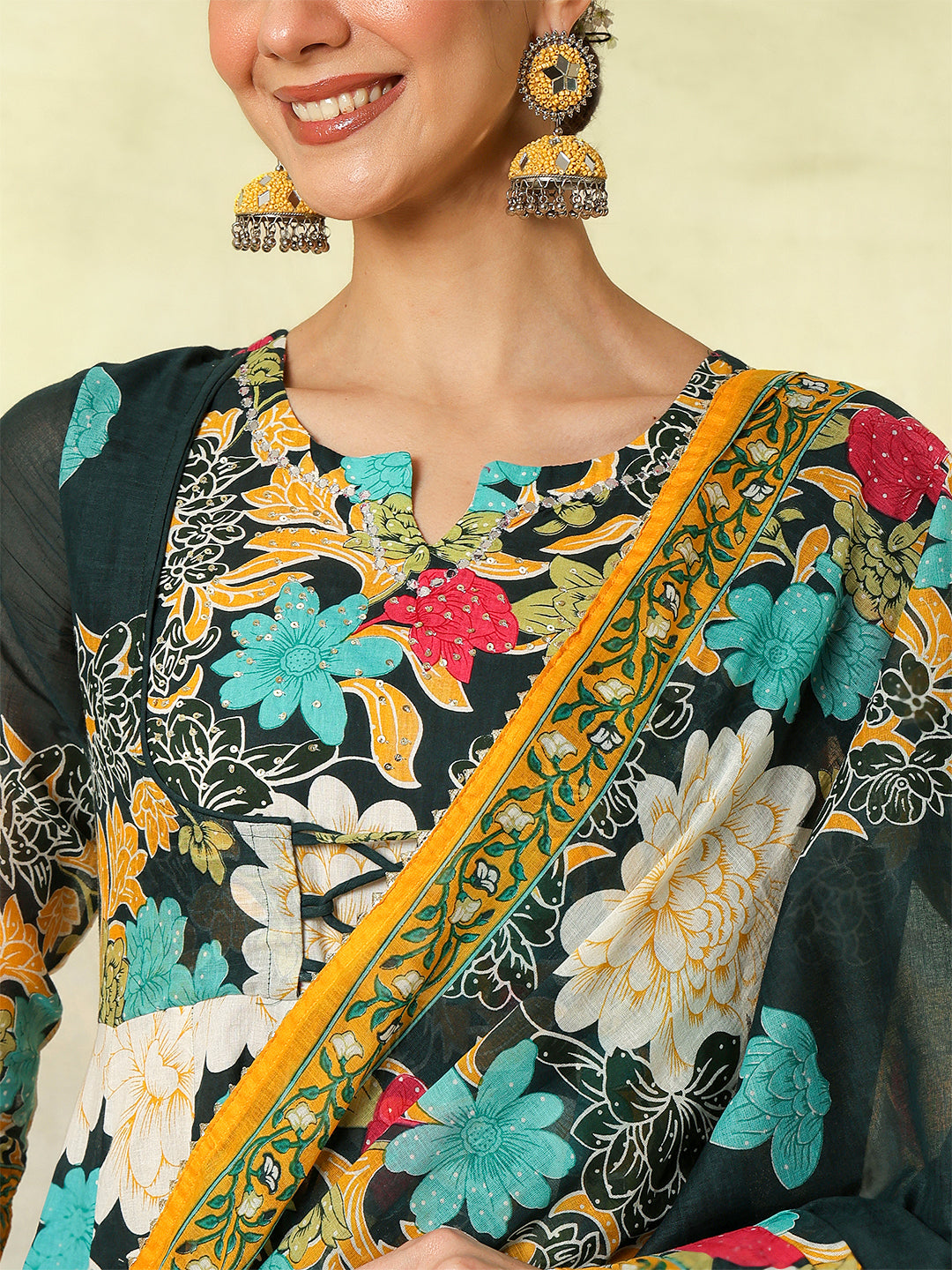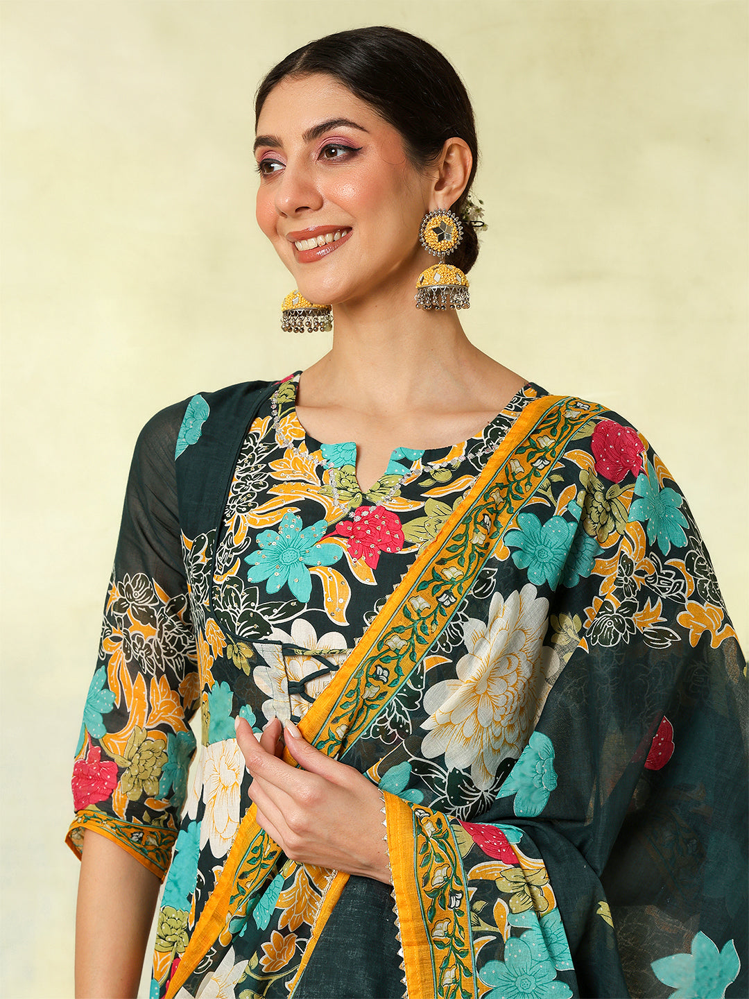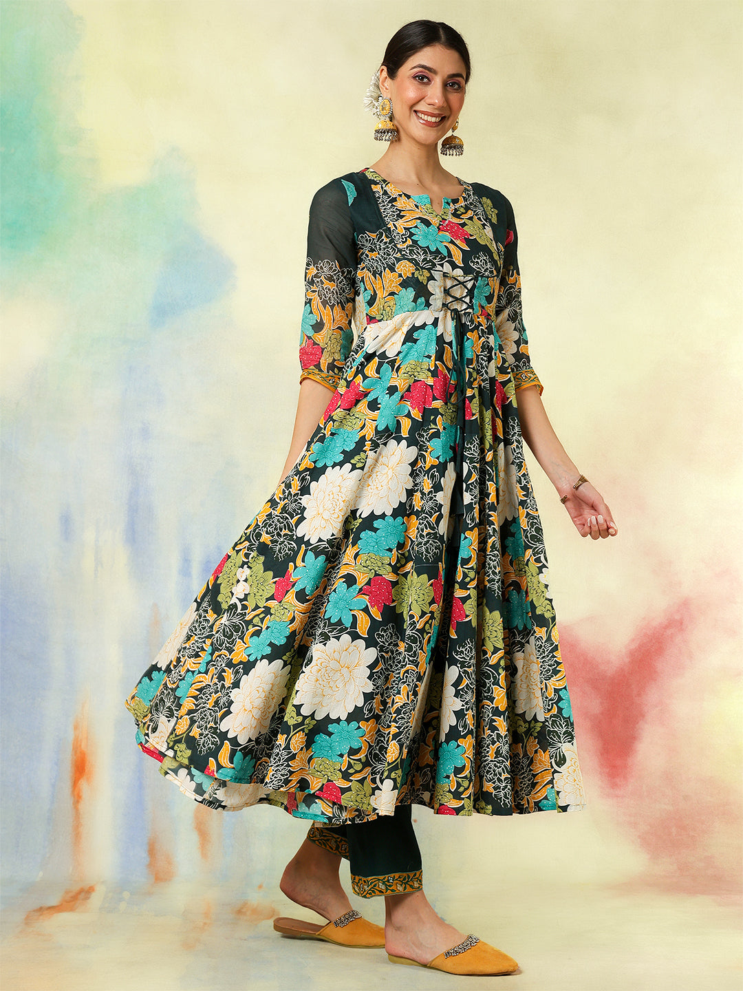 Upgrade your wardrobe with Green Cotton Flared Printed A-Line 3/4 Sleeves Round Neck Kurta Suit Set, designed for a chic and versatile appeal. The silhouette falls beautifully, giving a flattering shape while keeping the outfit breathable. A perfect pick for casual gatherings, office wear and everyday elegance.