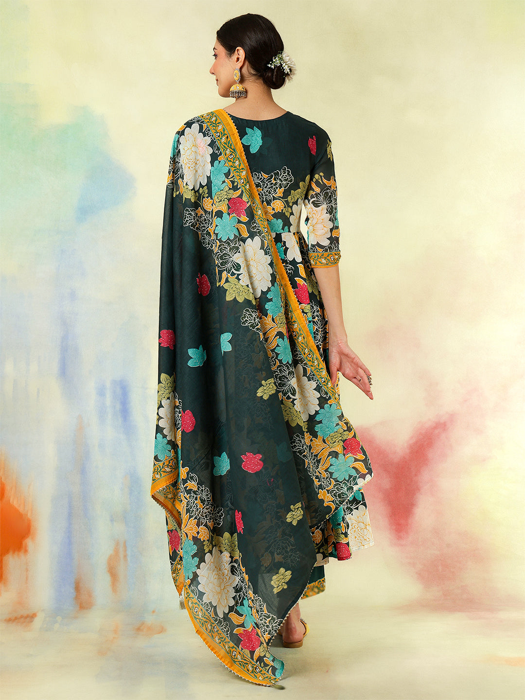 Green Cotton Flared Printed A-Line 3/4 Sleeves Round Neck Kurta Suit Set