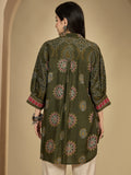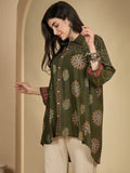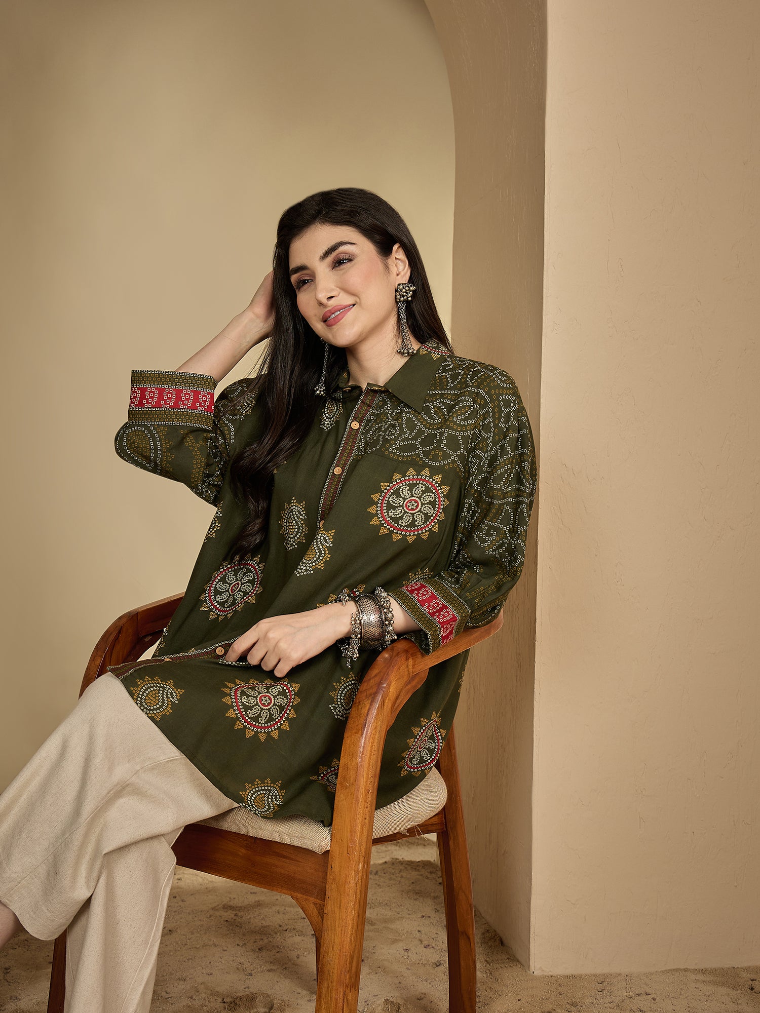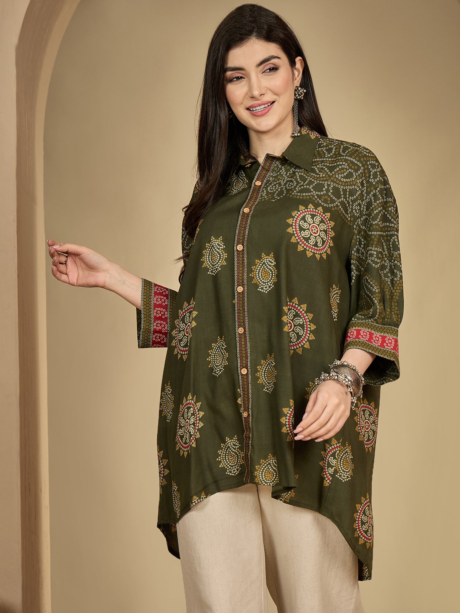 Green Rayon Hip Length Printed 3/4 Sleeve Shirt Collar Flared Top
