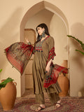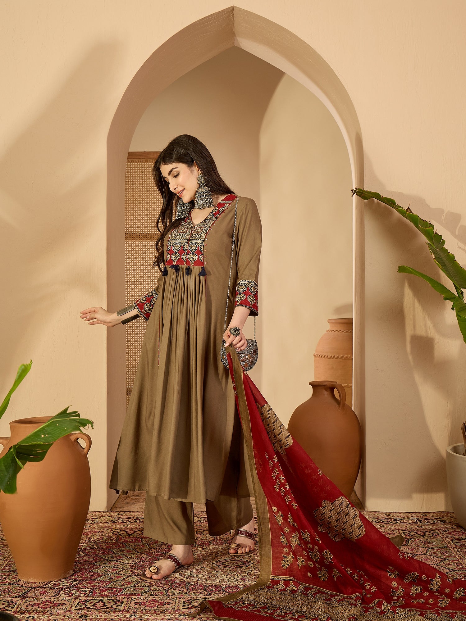 Upgrade your wardrobe with Grey Rayon Calf Length Solid 3/4 Sleeve V-Neck Flared Kurta Suit Set, designed for a chic and versatile appeal. The silhouette falls beautifully, giving a flattering shape while keeping the outfit breathable. A perfect pick for casual gatherings, office wear and everyday elegance.