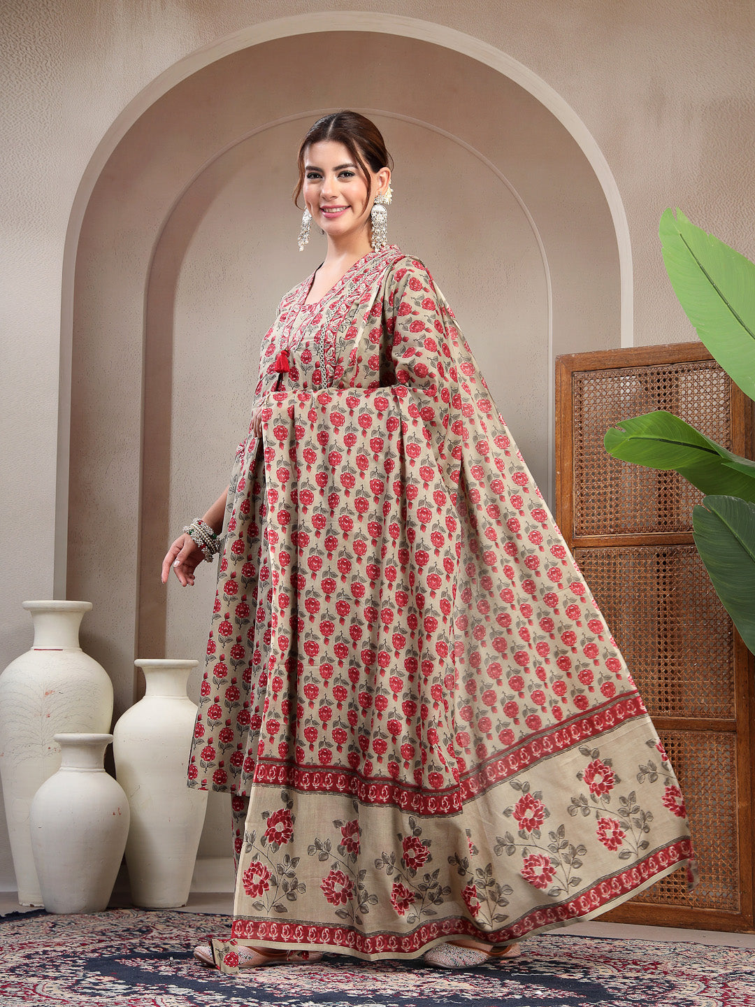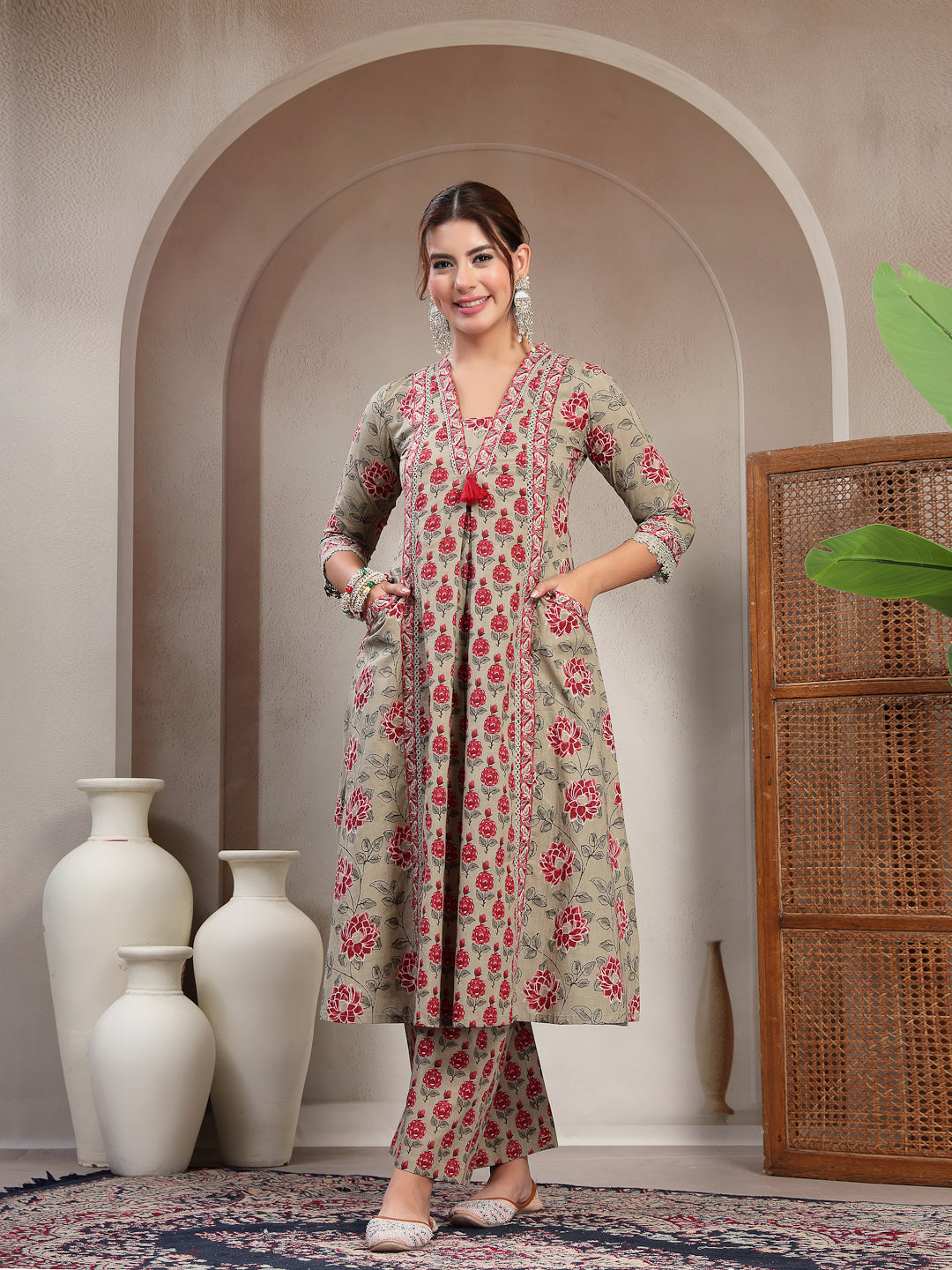Kashish Cotton Calf Length Printed 3/4 Sleeve V-Neck A-Line Kurta Suit Set