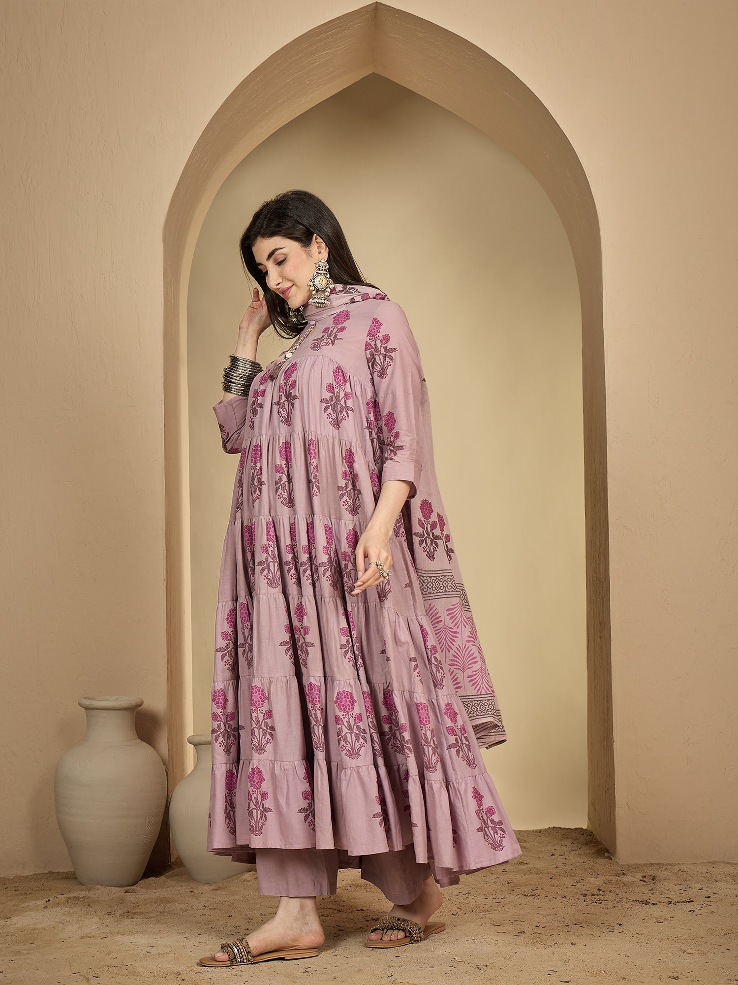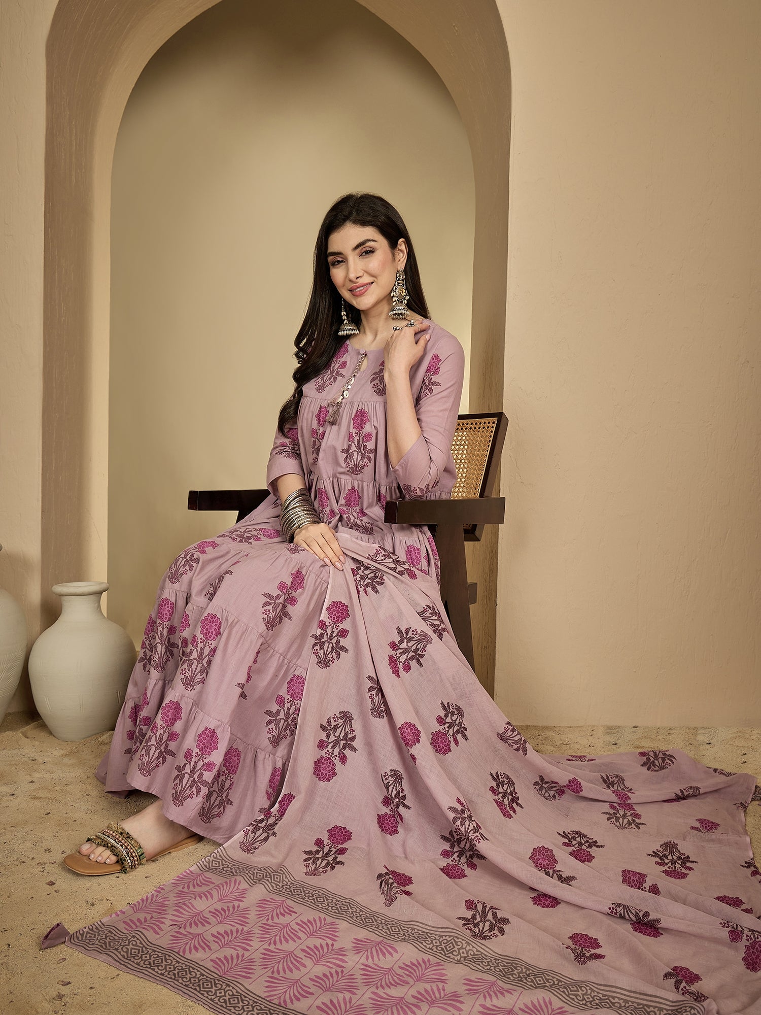 Kimayra Cotton Ankle Length Printed 3/4 Sleeve Key Hole Neck Anarkali Kurta Suit Set