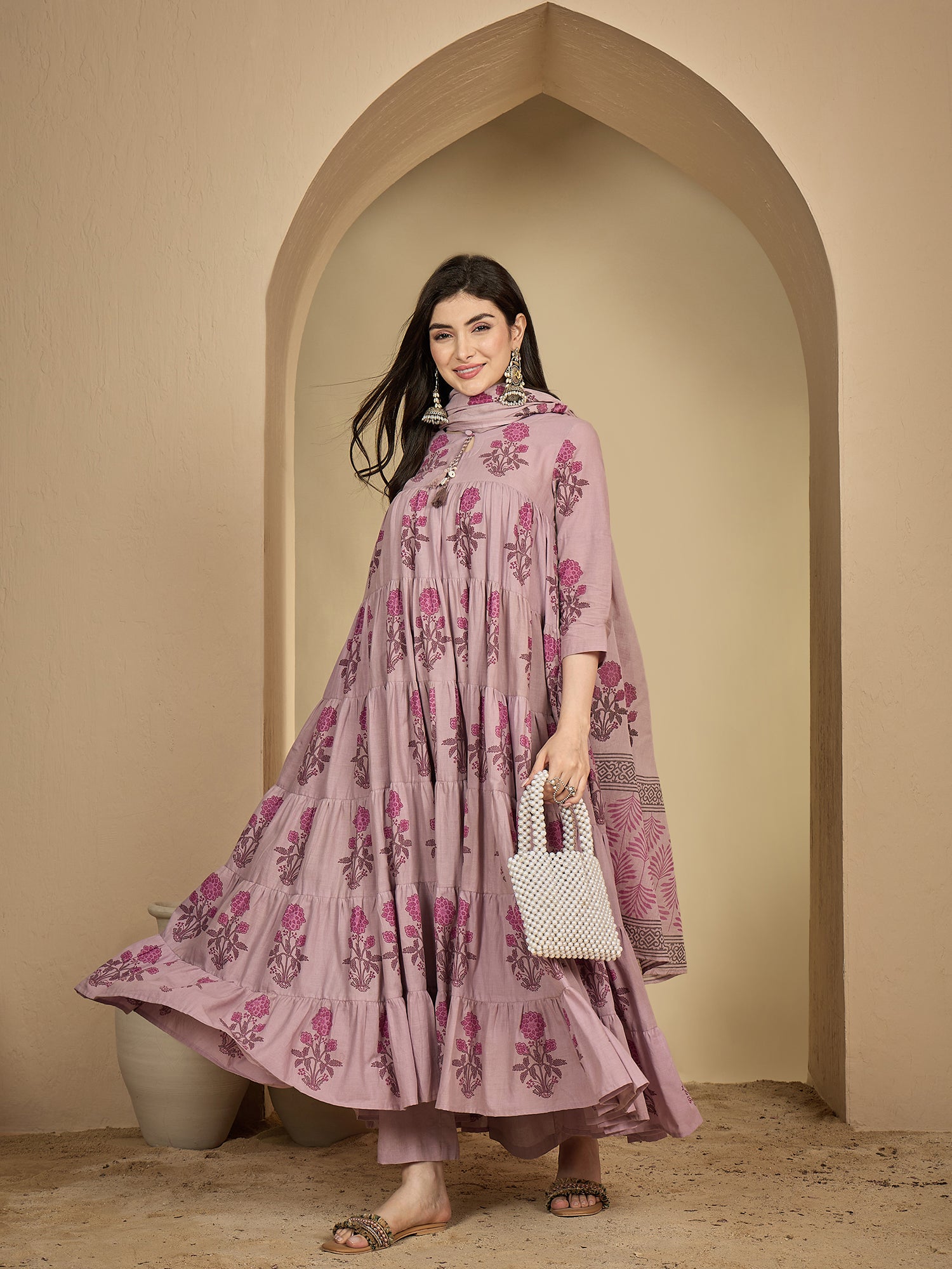 Make a subtle yet stylish statement with Kimayra Cotton Ankle Length Printed 3/4 Sleeve Key Hole Neck Anarkali Kurta Suit Set. The design offers a balanced mix of modern charm and traditional comfort. Its easy-fit structure makes it ideal for long hours, while the overall look stays effortlessly polished.
