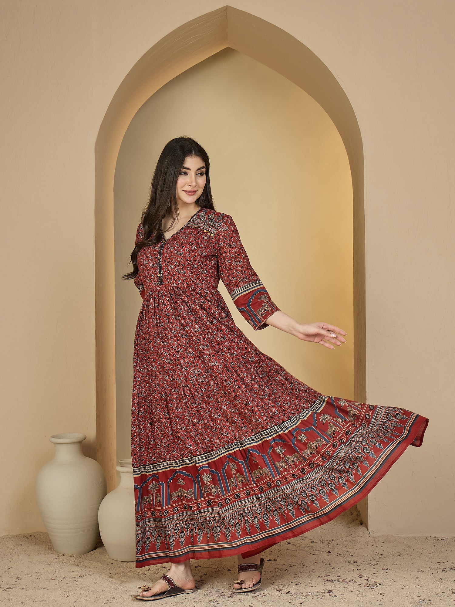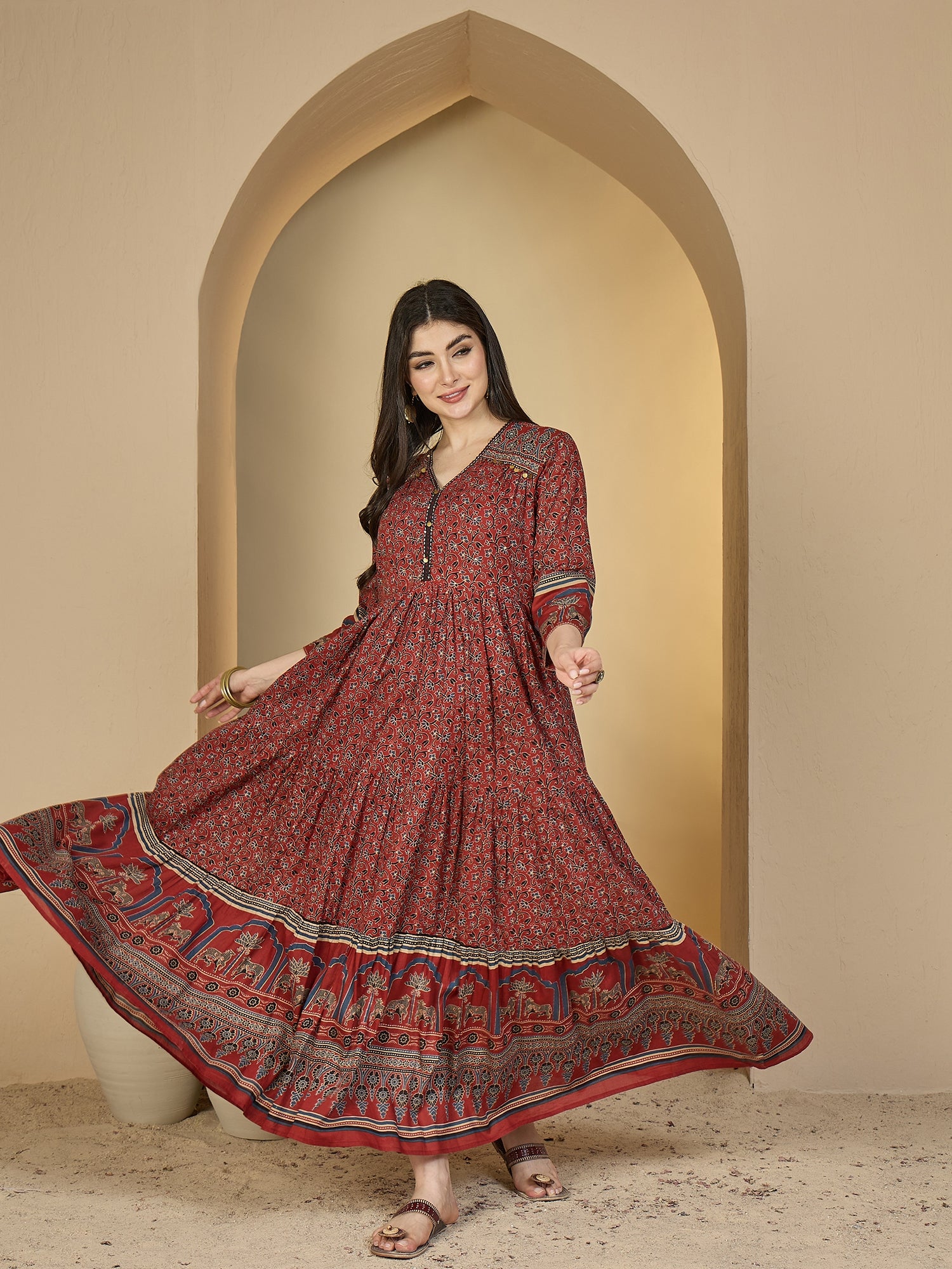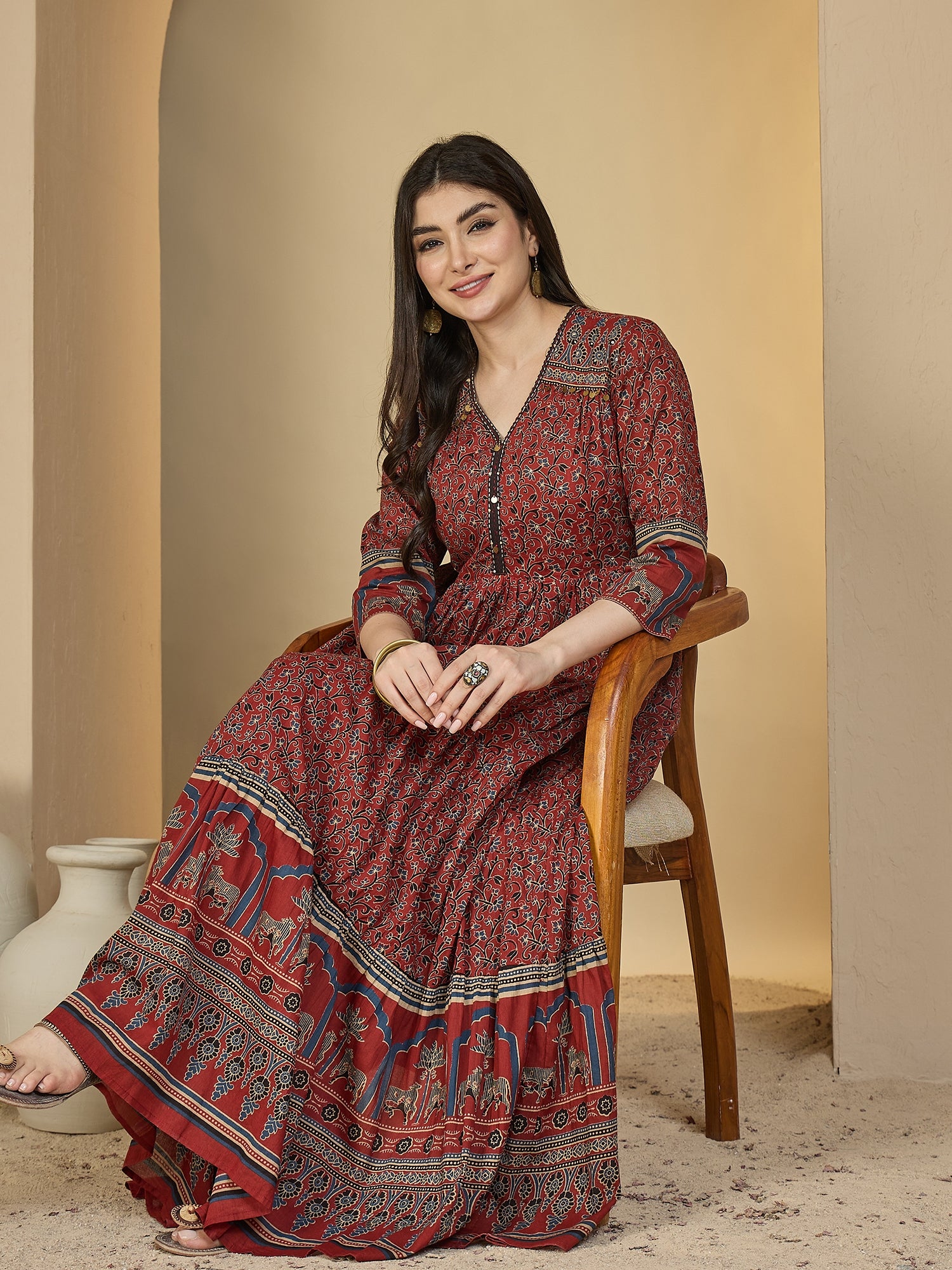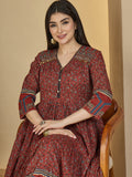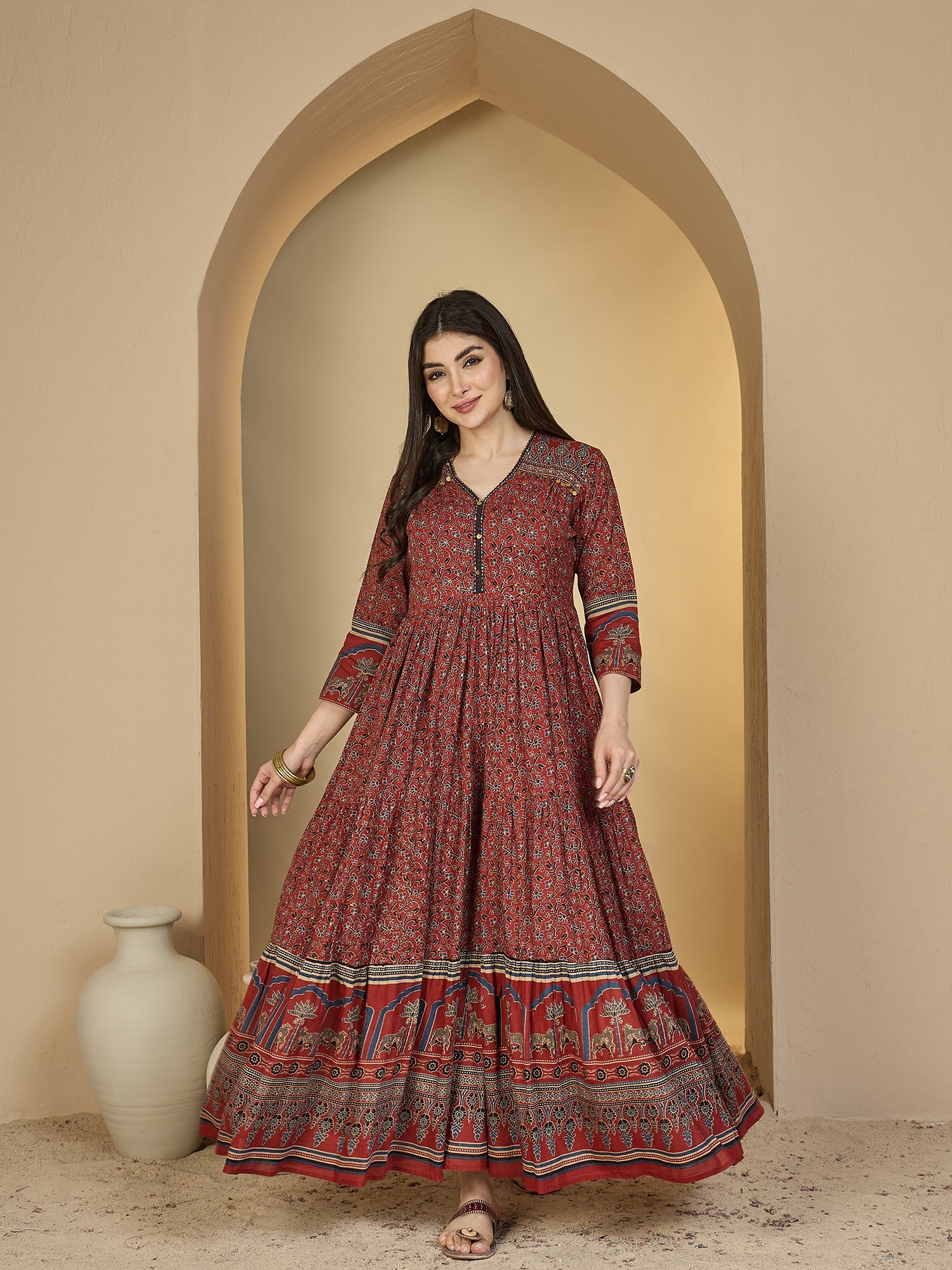 Maroon Cotton Ankle Length Printed 3/4 Sleeves V-Neck Anarkali Kurta