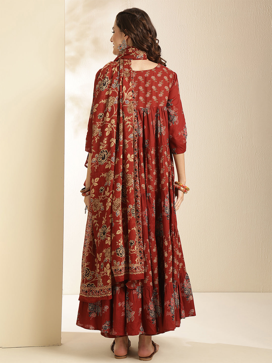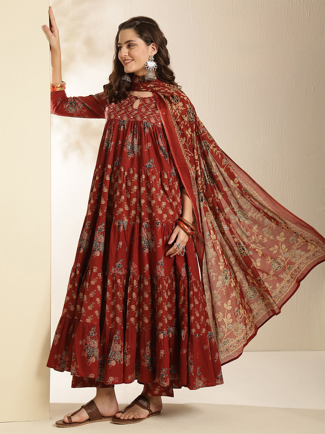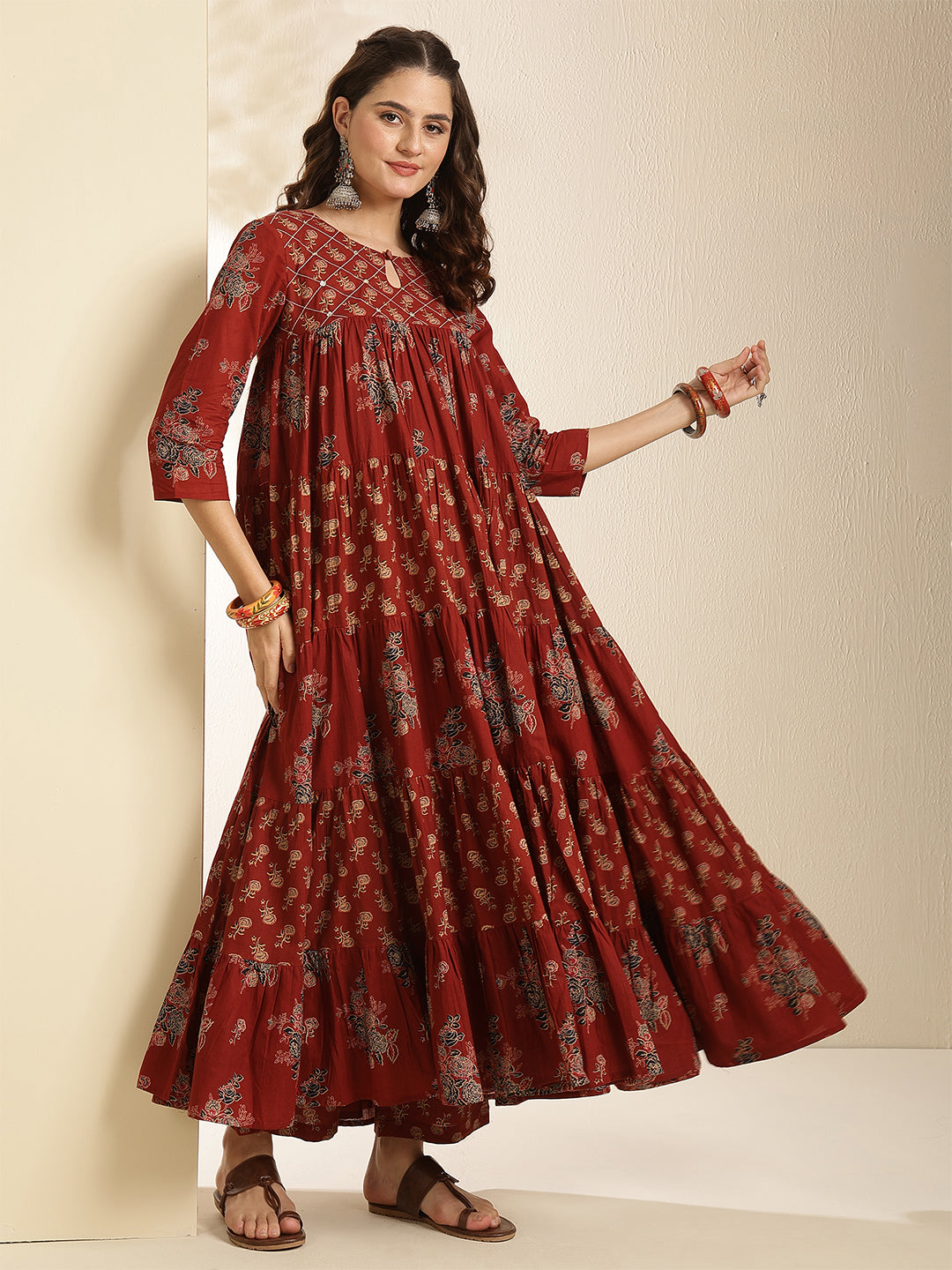 Maroon Cotton Calf Length Printed 3/4 Sleeve Key Hole Neck Tired Kurta Suit Set