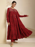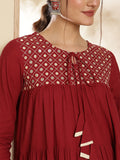 Maroon Cotton Calf Length Printed Full Sleeve Key Hole Neck Tired Kurta Suit Set