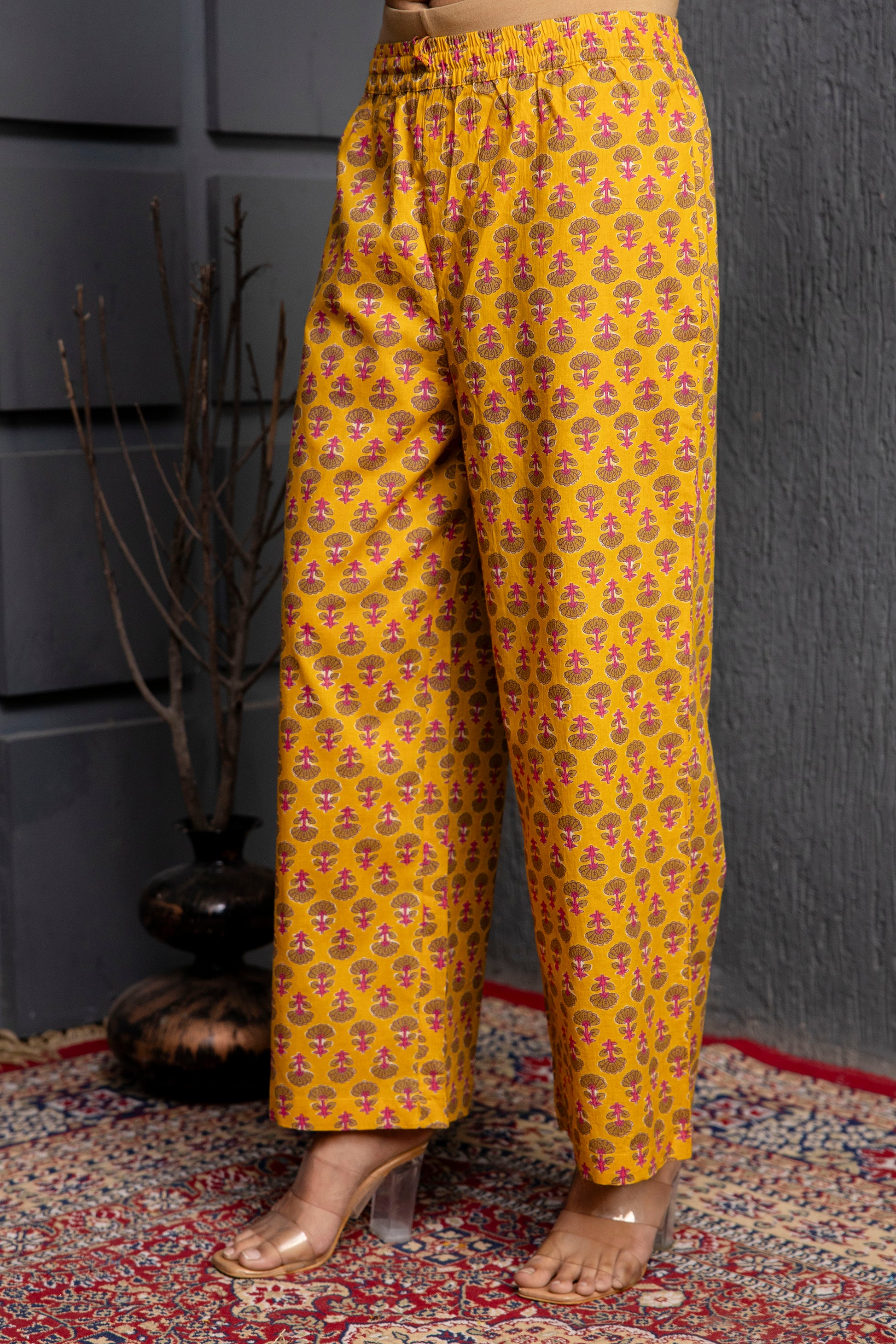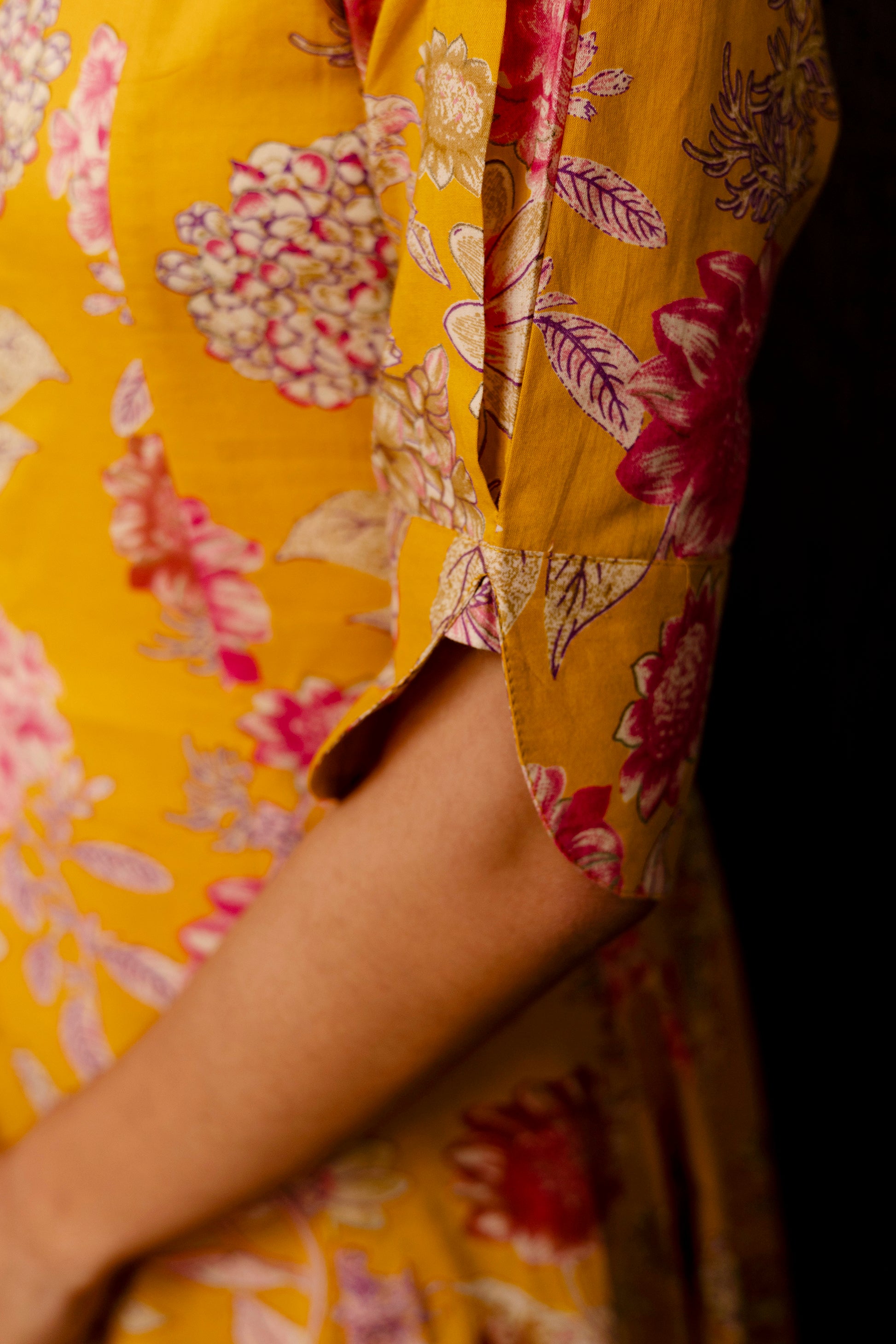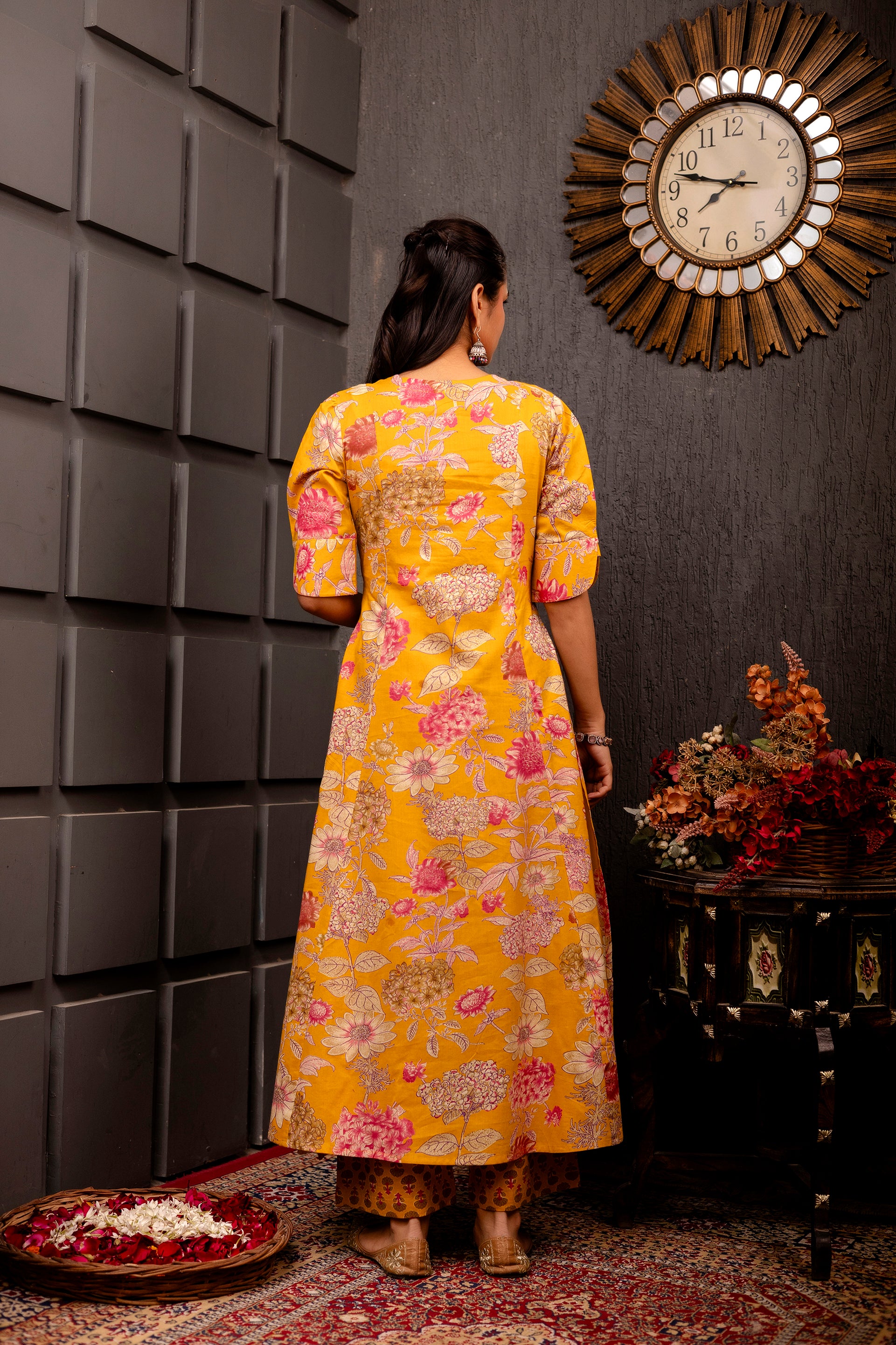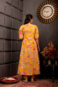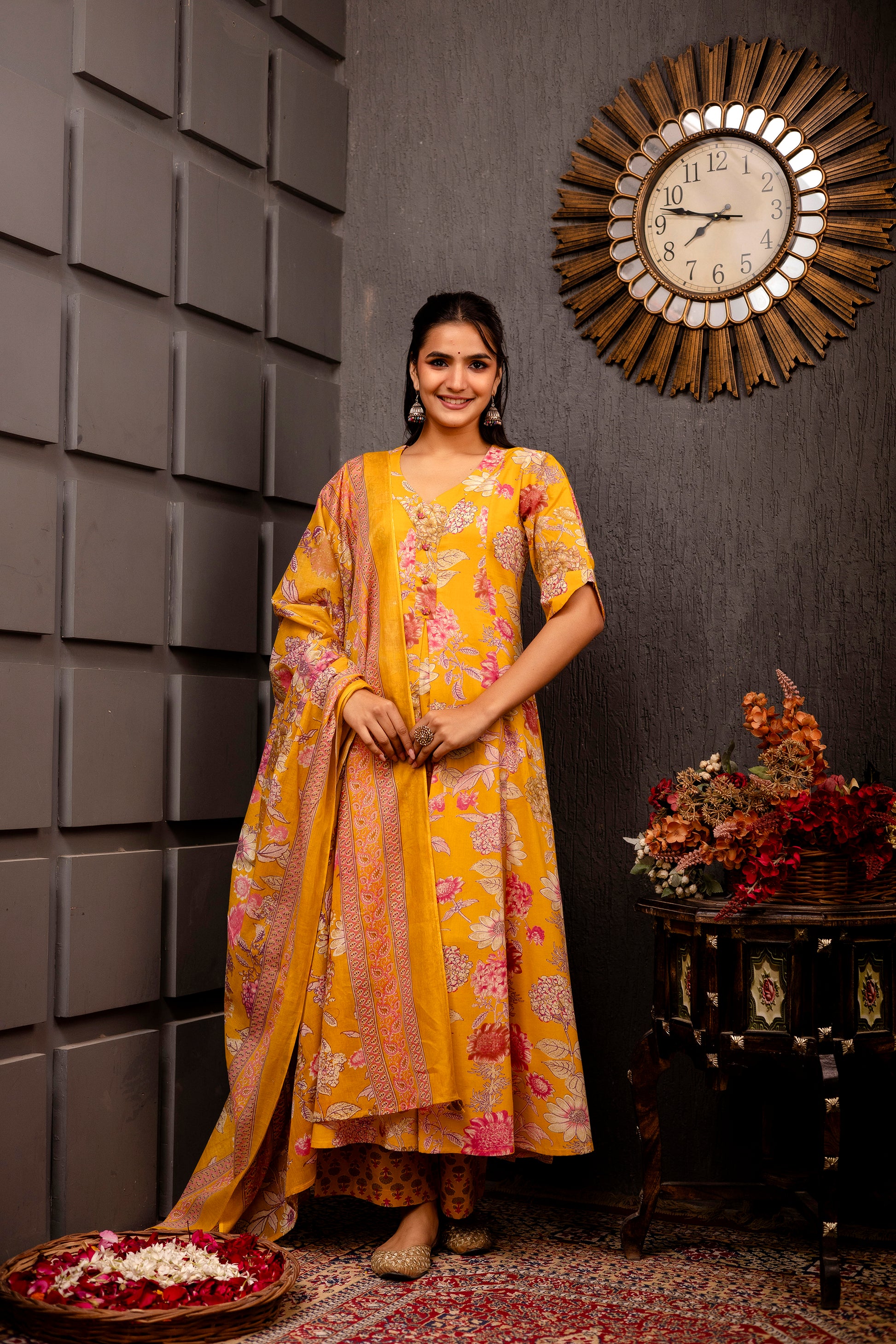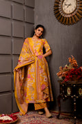 Mustard Cotton Calf Length Printed Flared 3/4 Sleeves V-Neck Kurta Suit Set brings a fresh blend of comfort and elegance, crafted with attention to detail. Its design makes it perfect for daily wear as well as casual outings, offering effortless style. Soft fabric ensures comfort through the day, keeping the look refined and graceful.