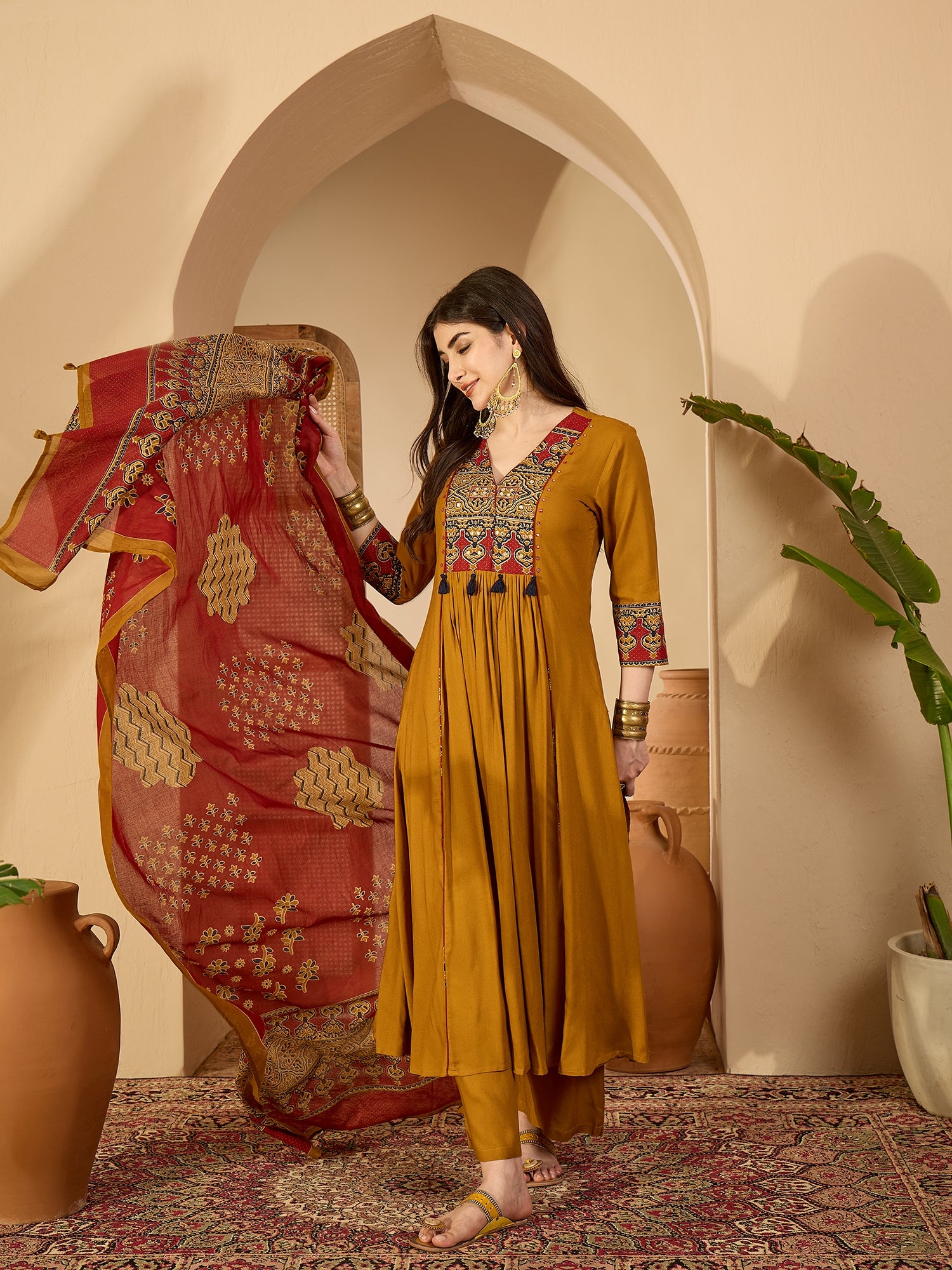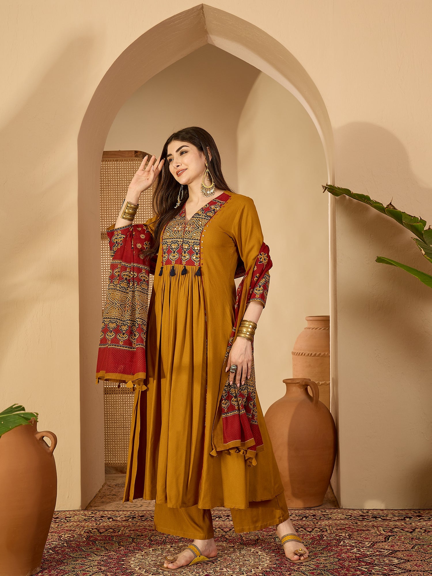 Mustard Rayon Calf Length Solid 3/4 Sleeve V-Neck Flared Kurta Suit Set brings a fresh blend of comfort and elegance, crafted with attention to detail. Its design makes it perfect for daily wear as well as casual outings, offering effortless style. Soft fabric ensures comfort through the day, keeping the look refined and graceful.