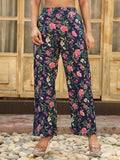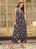Navy Cotton Calf Length Printed Flared Sleevelesss V-Neck Kurta Bottom Set