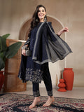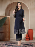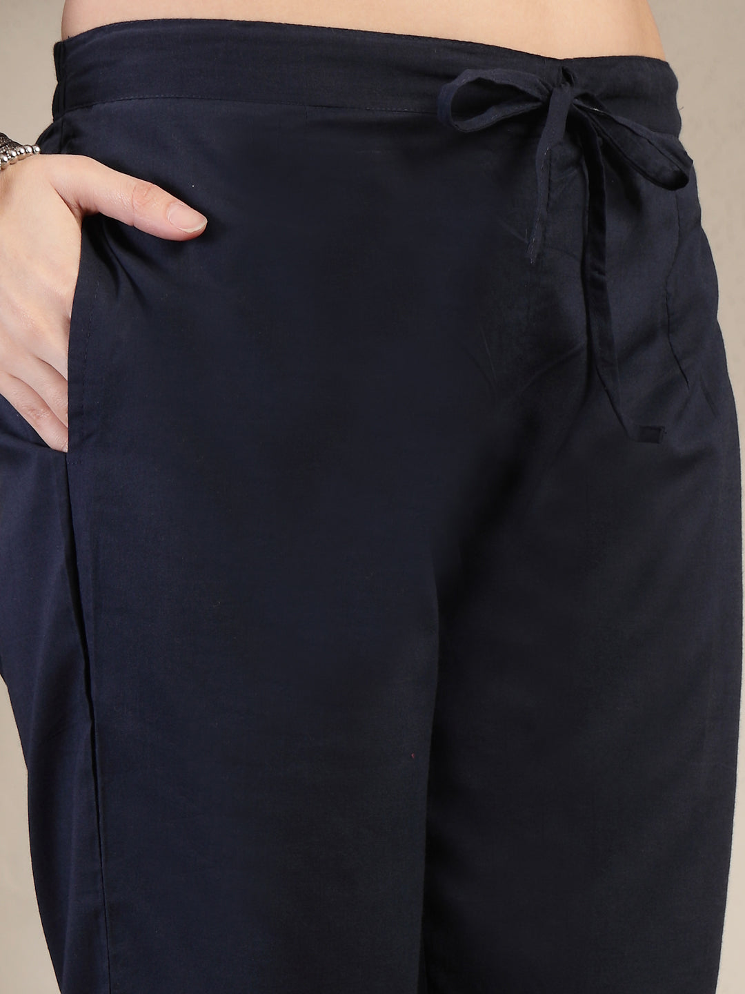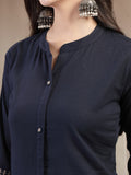 Upgrade your wardrobe with Navy Cotton Calf Length Solid 3/4 Sleeve Mandarin Collar Straight Kurta Suit Set, designed for a chic and versatile appeal. The silhouette falls beautifully, giving a flattering shape while keeping the outfit breathable. A perfect pick for casual gatherings, office wear and everyday elegance.