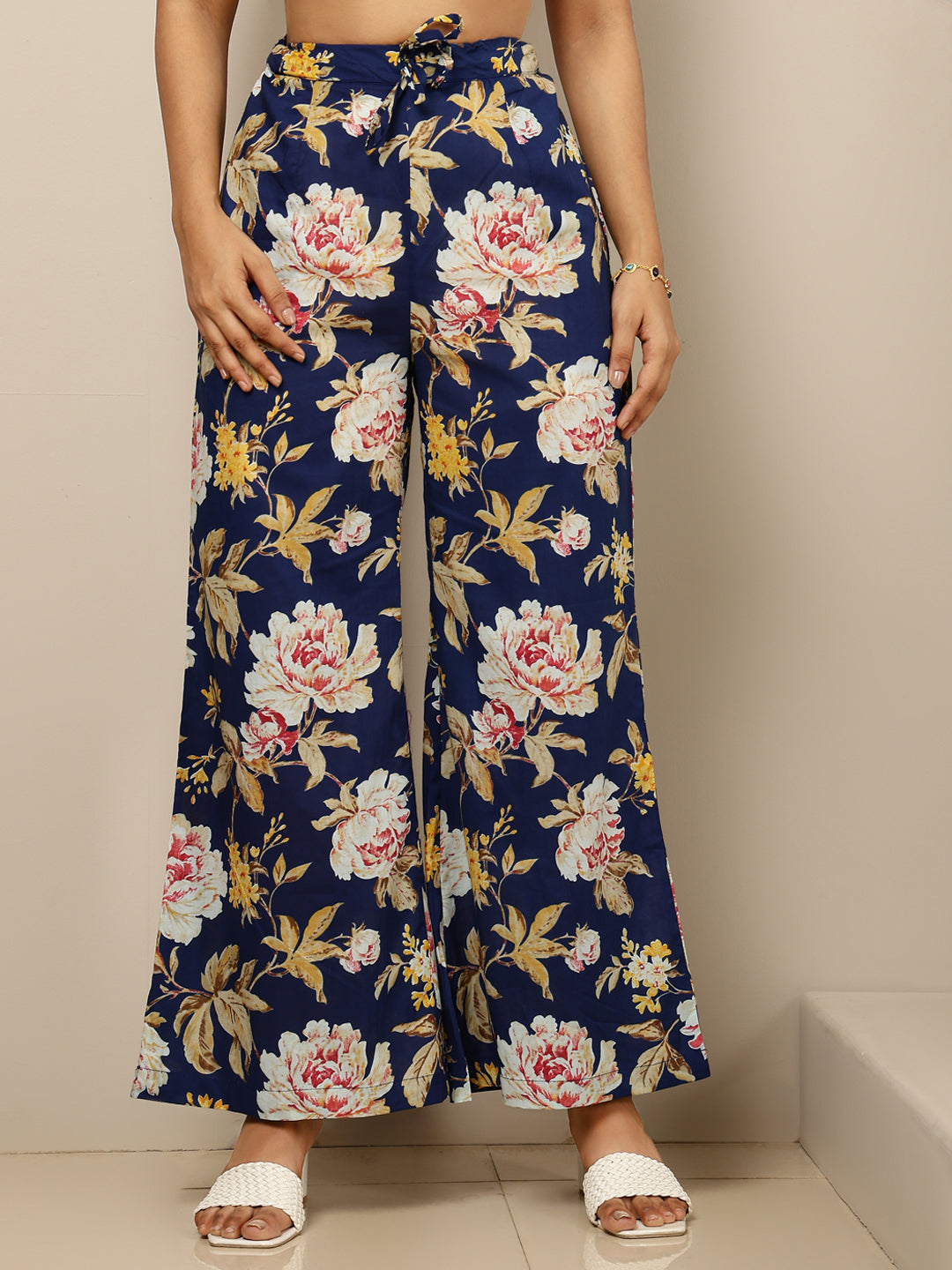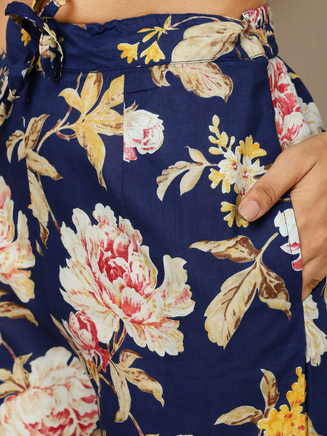 Navy Cotton Hip Length Printed Straight 3/4 Sleeves Round Neck Kurta Bottom Set
